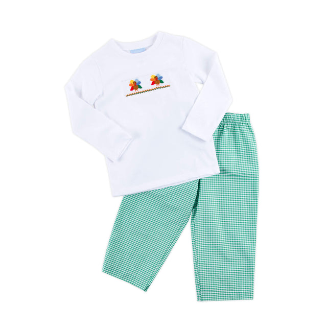 Get your little one ready for your family gathering this Thanksgiving in our Fall Turkey Smocked Green Windowpane Pant Set! The white long sleeve knit shirt features two adorable smocked turkeys. Paired with green windowpane pants.