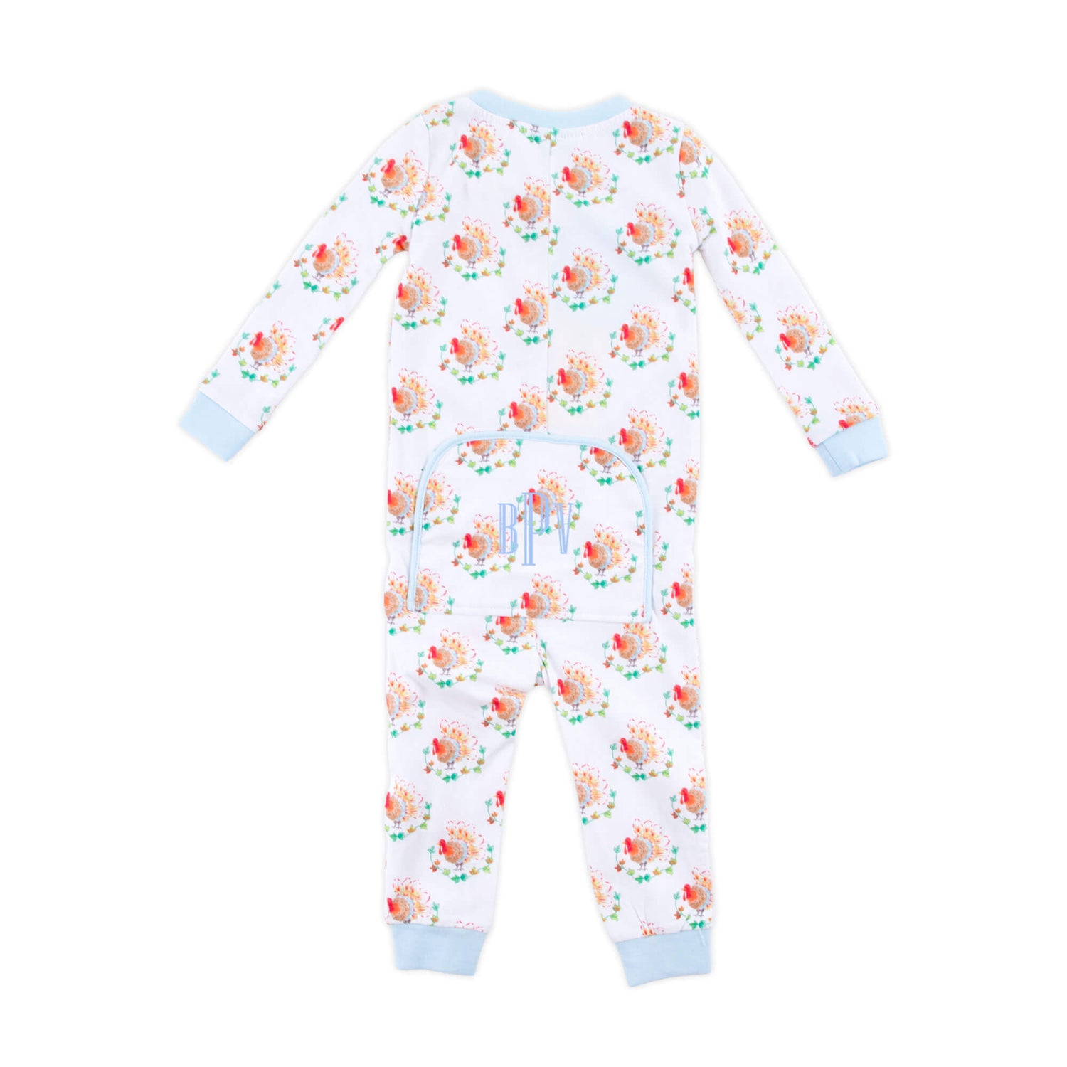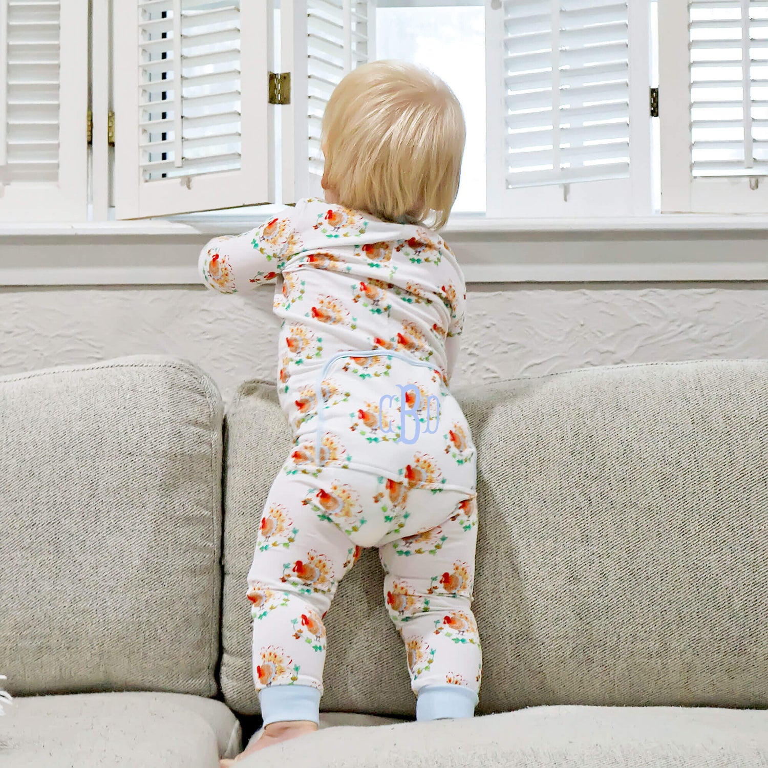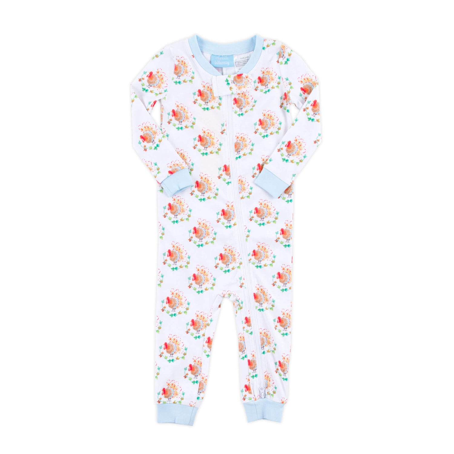 Get ready for Thanksgiving fun with our adorable Feathery Turkey Blue Zip Sleeper! This cozy knit sleeper features a charming turkey print, sweet blue ribbing trim, and a convenient 2-way zipper for easy changes. Available in both footed and footless styles in select sizes, it's perfect for Thanksgiving morning snuggles, story time, and beyond. Add a monogram for an extra special touch that makes this keepsake even sweeter!