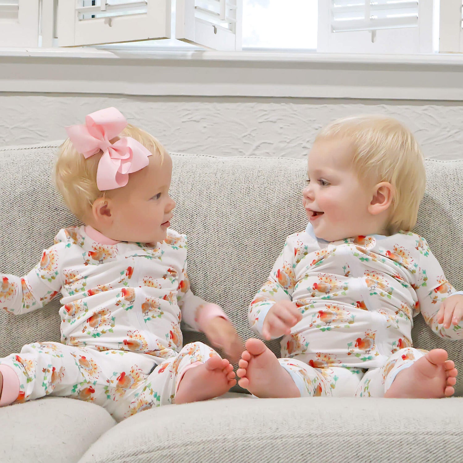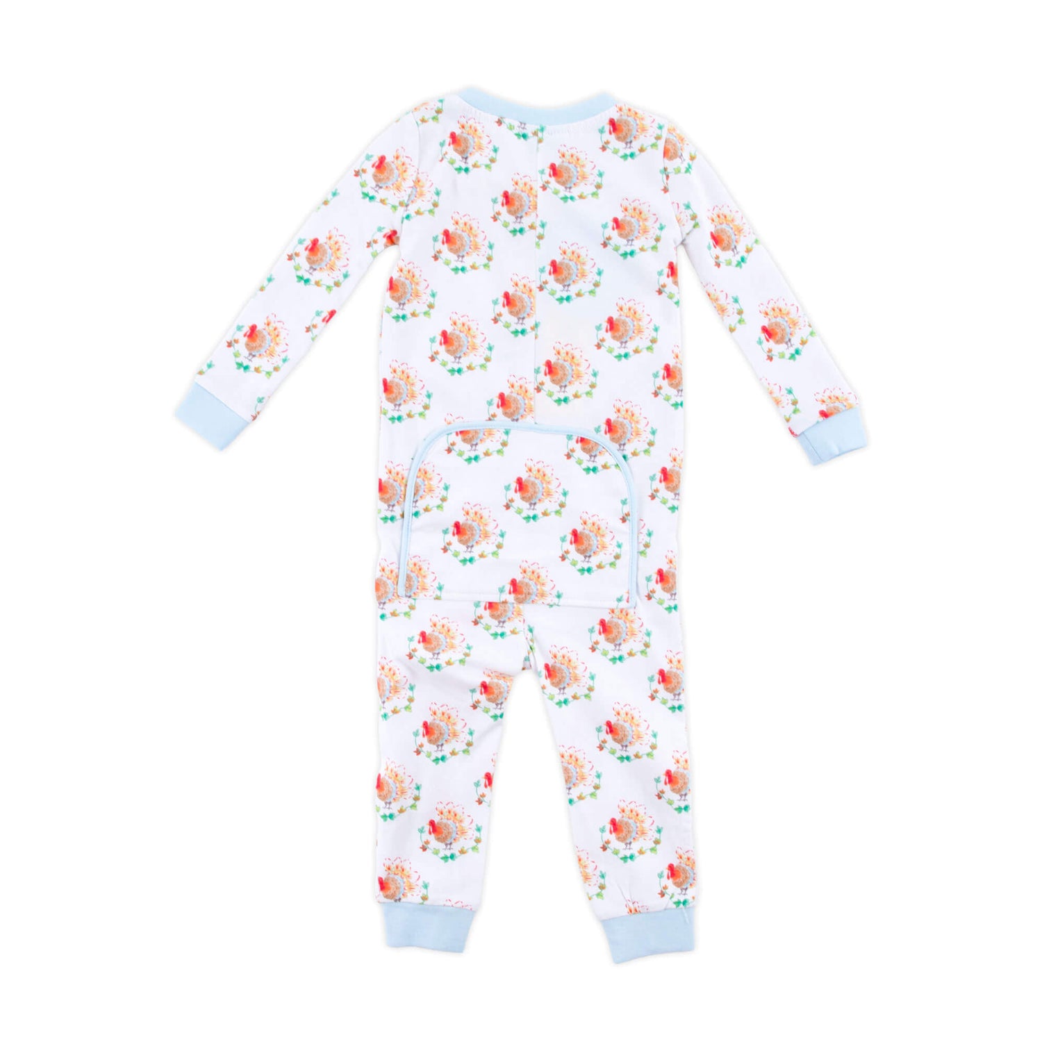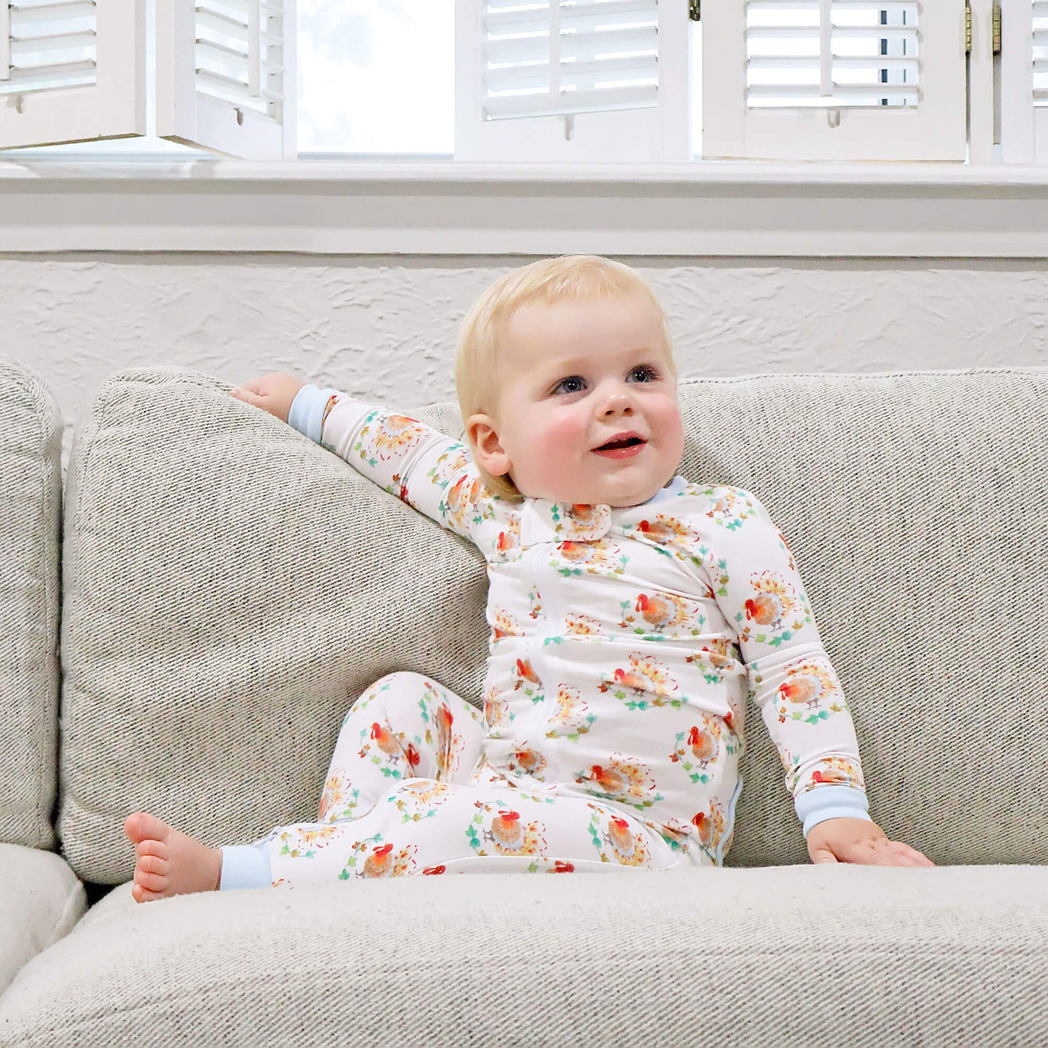 Get ready for Thanksgiving fun with our adorable Feathery Turkey Blue Zip Sleeper! This cozy knit sleeper features a charming turkey print, sweet blue ribbing trim, and a convenient 2-way zipper for easy changes. Available in both footed and footless styles in select sizes, it's perfect for Thanksgiving morning snuggles, story time, and beyond. Add a monogram for an extra special touch that makes this keepsake even sweeter!