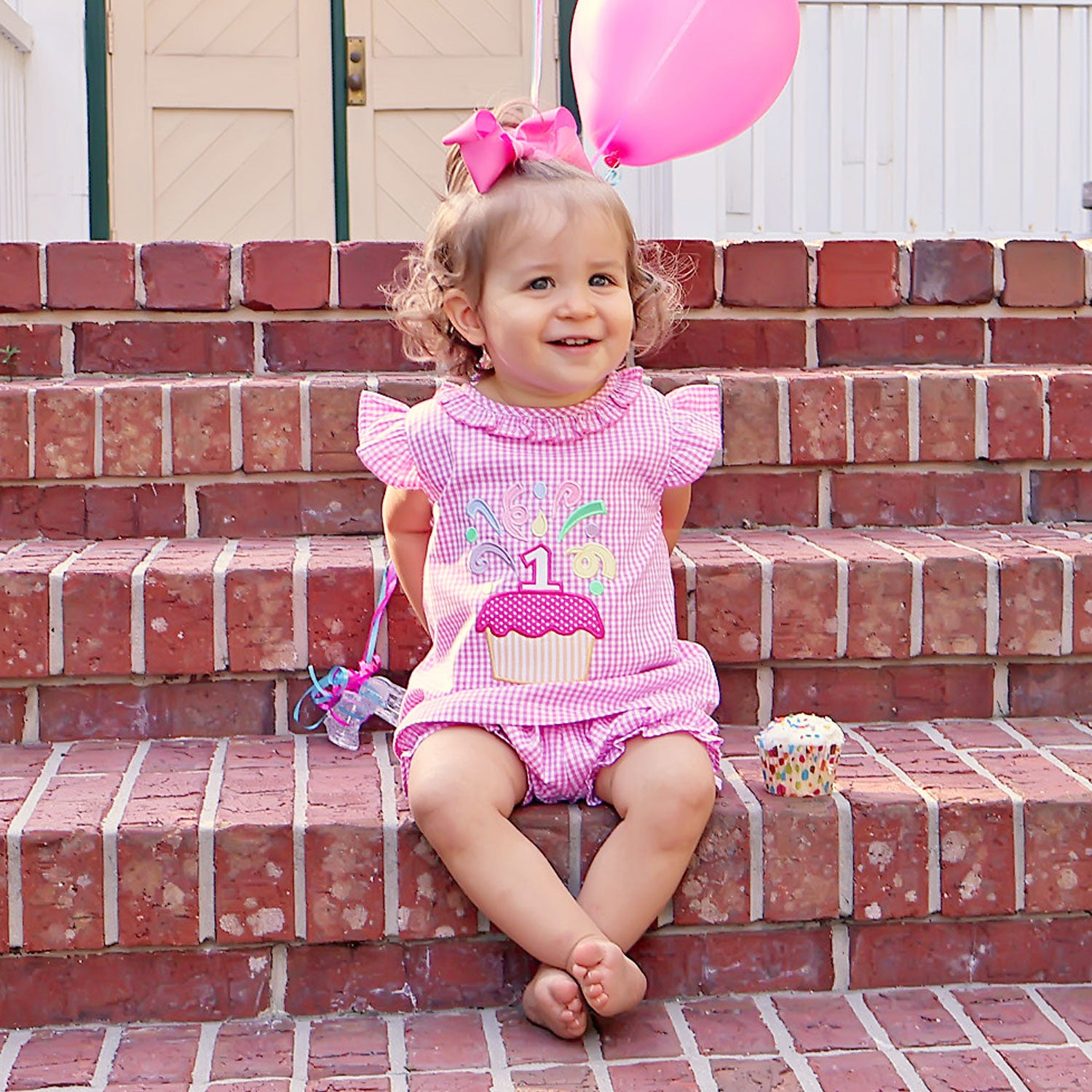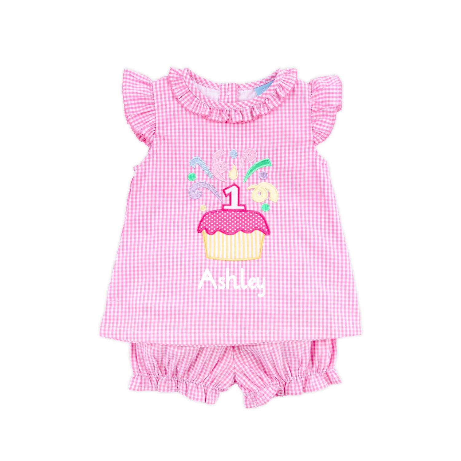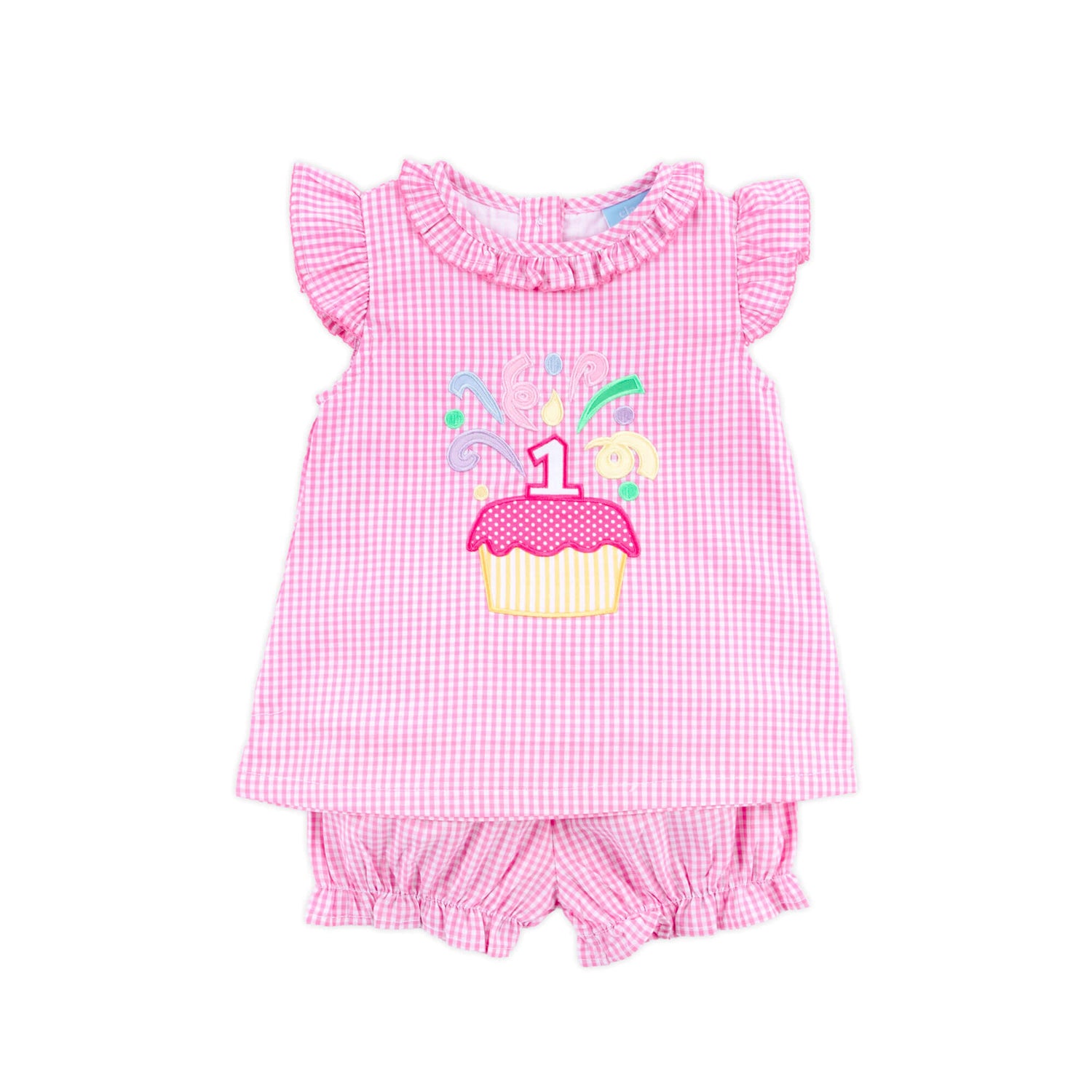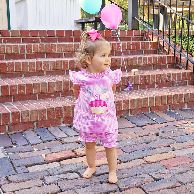 This sweet First Birthday Cupcake Bloomer Set is perfect for your little one's Birthday! The pink gingham top features an adorable 1st birthday applique, ruffle sleeves and collar with pink picot trim, making it a fun choice! The set comes with matching bloomer shorts. Add a monogram for a personalized touch!