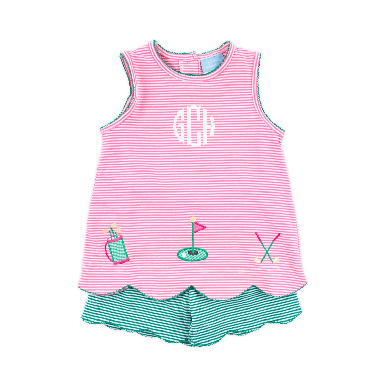 Get your little one ready for a golf adventure with the Golf Life Pink Stripe Cleo Short Set. The sleeveless pink knit stripe top features a scallop hem and playful golf scene appliques, and the set includes coordinating green stripe knit shorts. Add a monogram to complete the look.