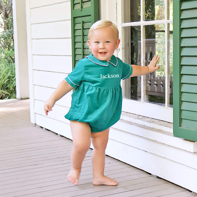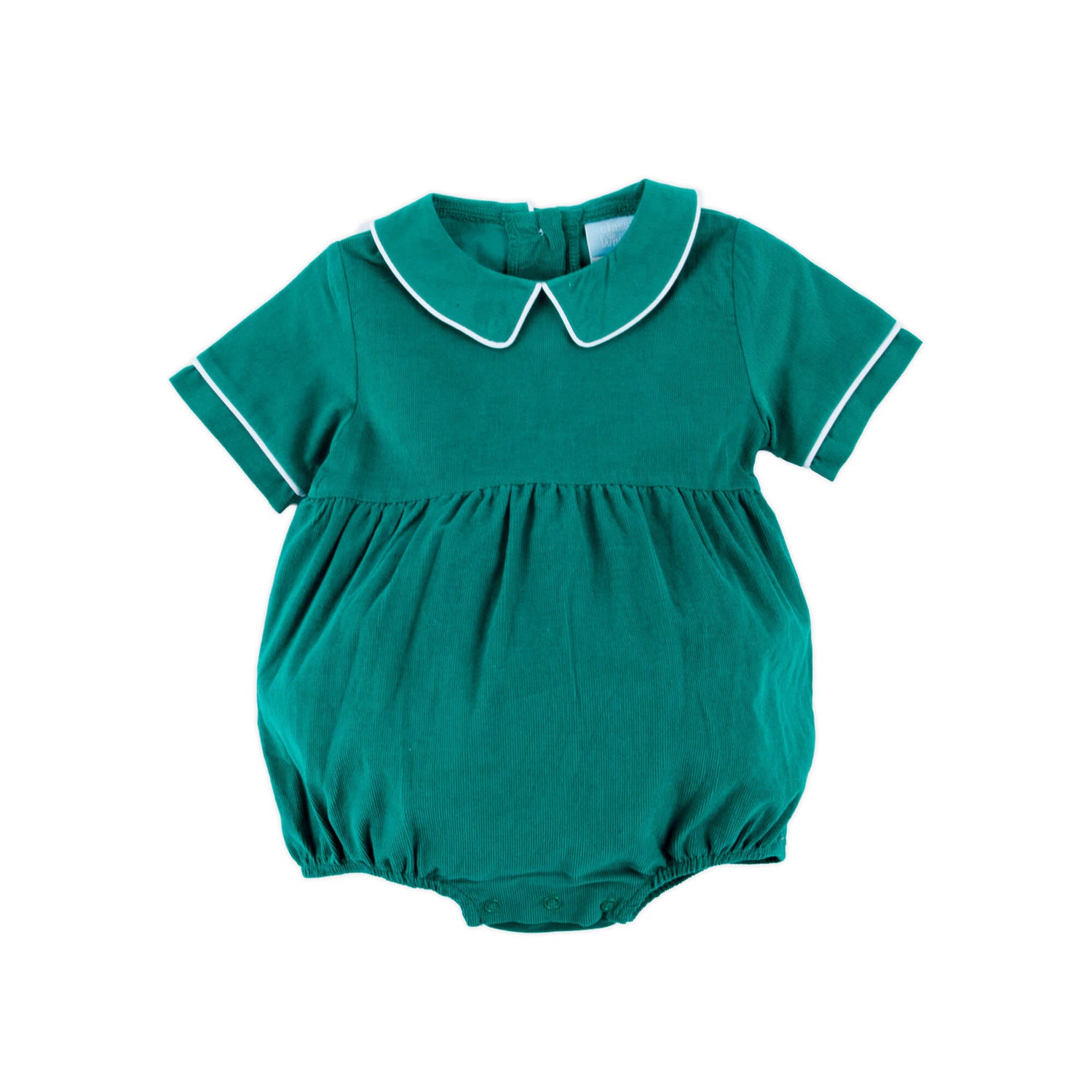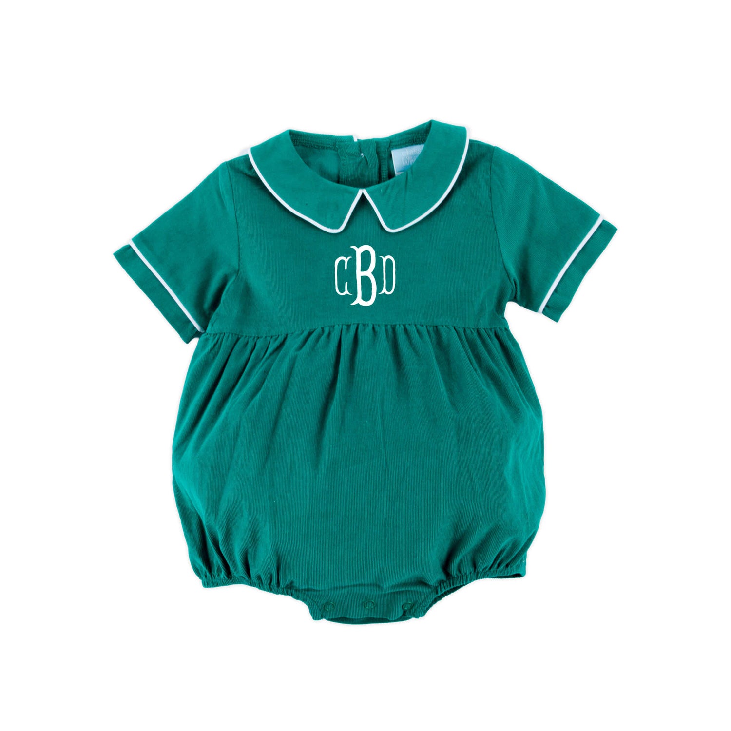 This Corduroy Collared Bubble is perfect for Christmas gatherings. This festive corduroy bubble features an elegant collar and short sleeves with white piping trim, making it perfect for visits to Santa and hanging ornaments on the tree. A timeless choice for your holiday celebrations! Convenient snaps in the stride ensure easy changes. Add a monogram to make this outfit even more special.
