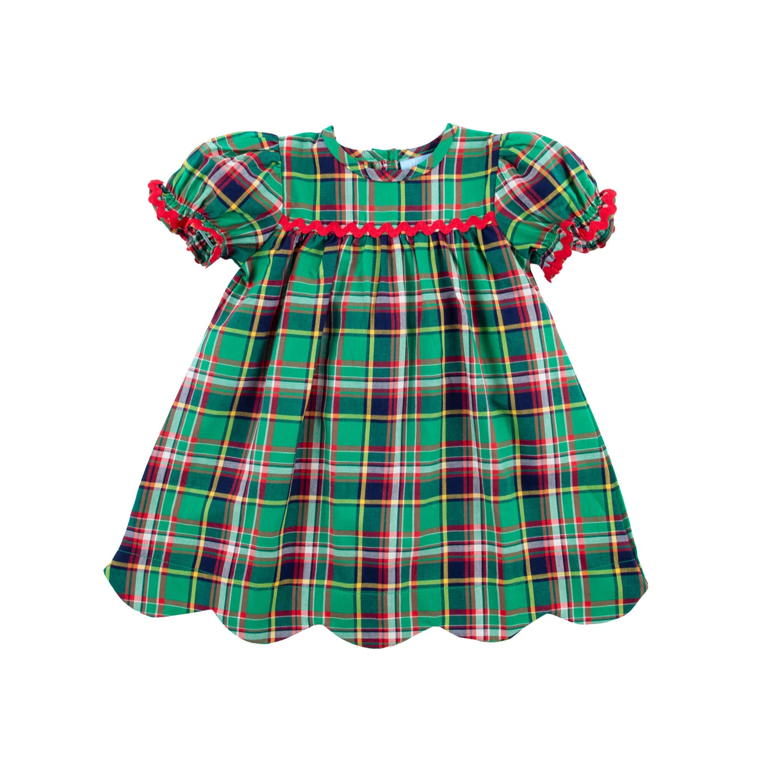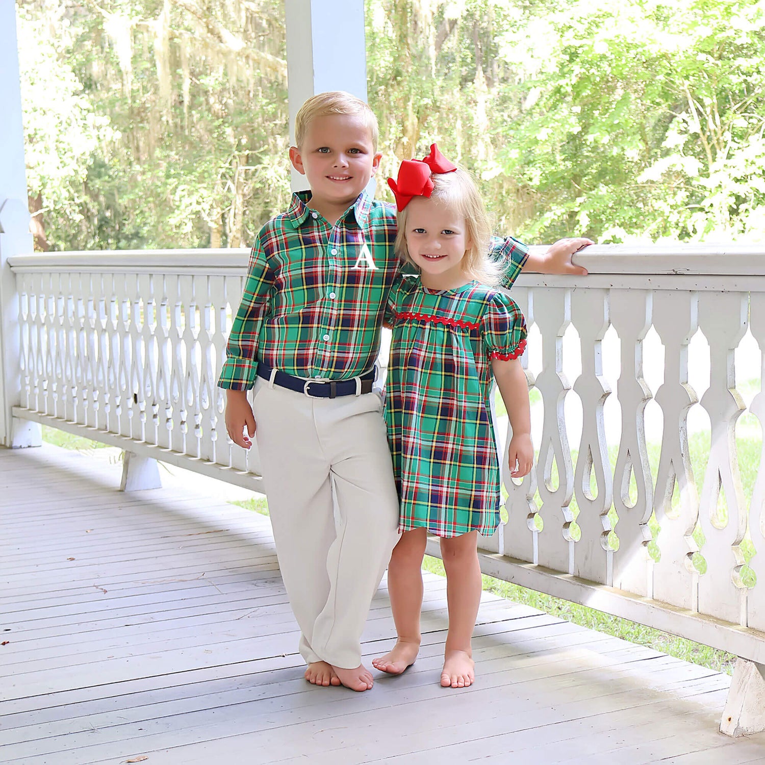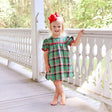 This Hampton Plaid Dress is the perfect holiday dress! Adorned with elegant red ric rac trim and bishop sleeves, this vibrant green plaid dress adds a touch of holiday charm. It's ideal for a Christmas card, a holiday party, or visiting Santa.