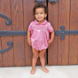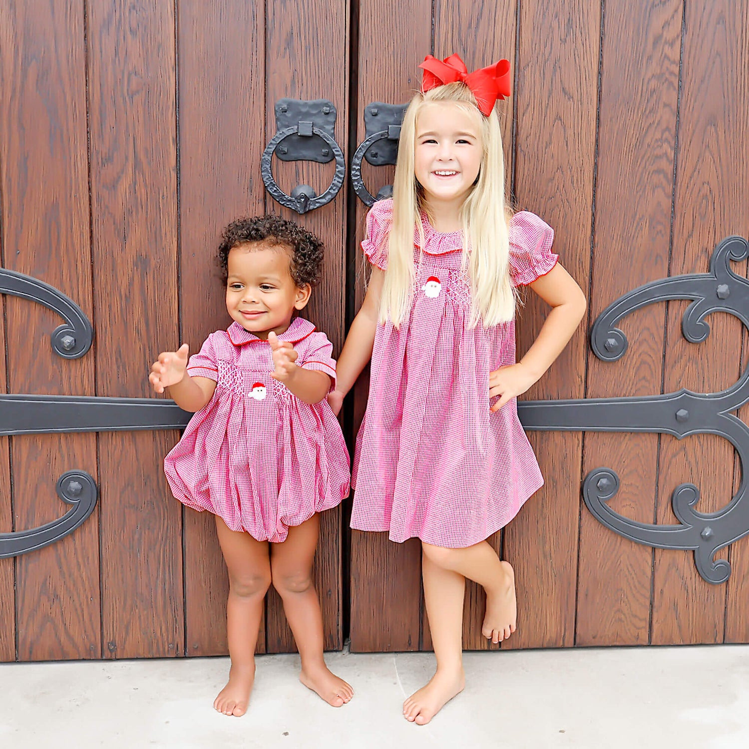 Experience the magic of the holiday season with our Happy Santa French Knot Red Gingham Bishop Bubble. This red gingham bubble features geometric smocking and a French knot Santa, along with an adorable elegant collar and classic short sleeves. Snaps along the stride make for easy changes.