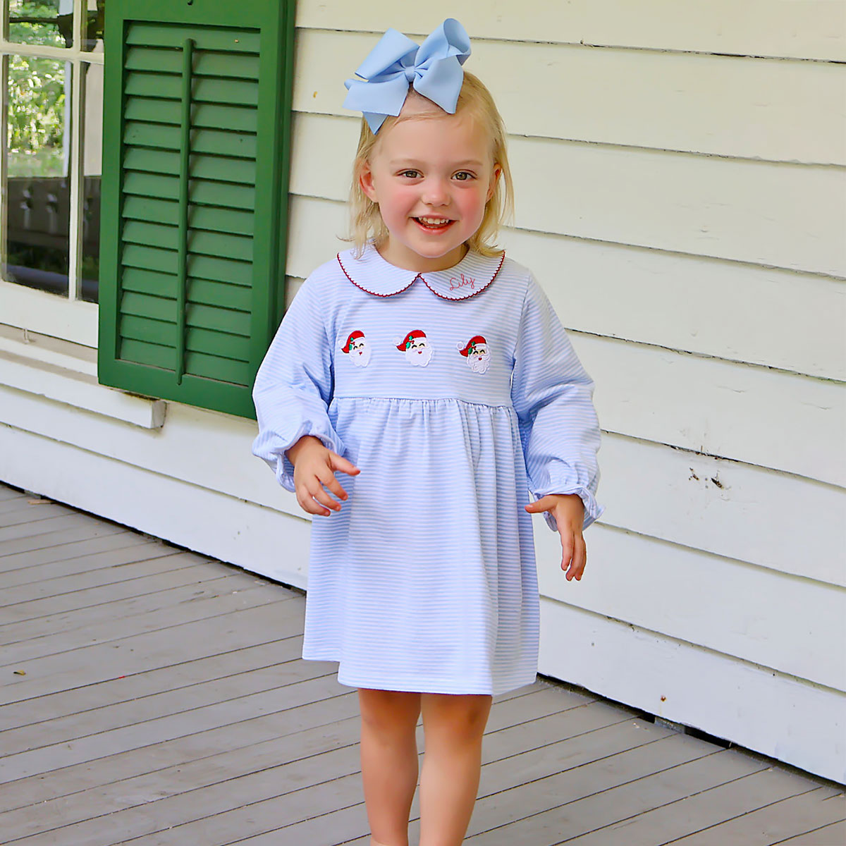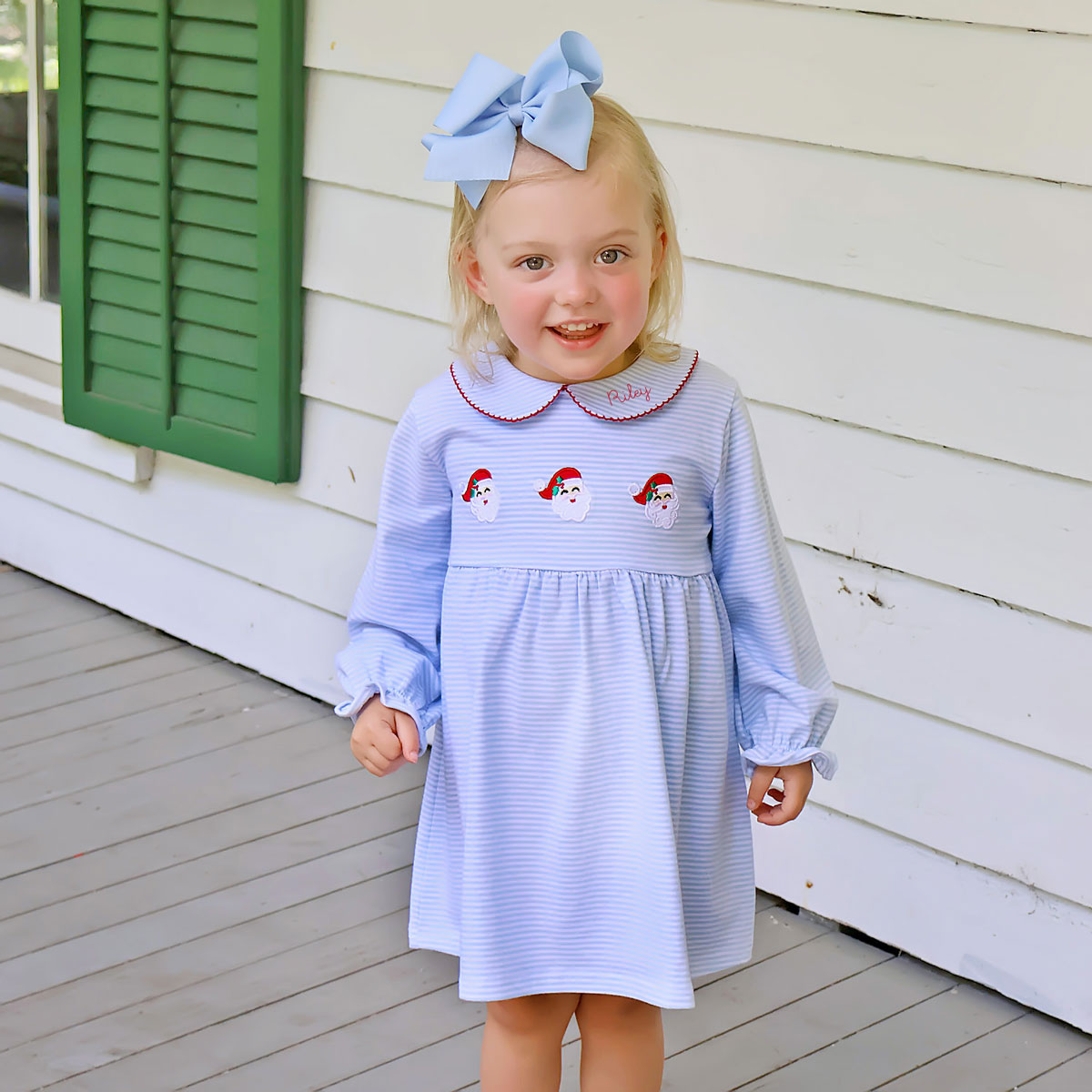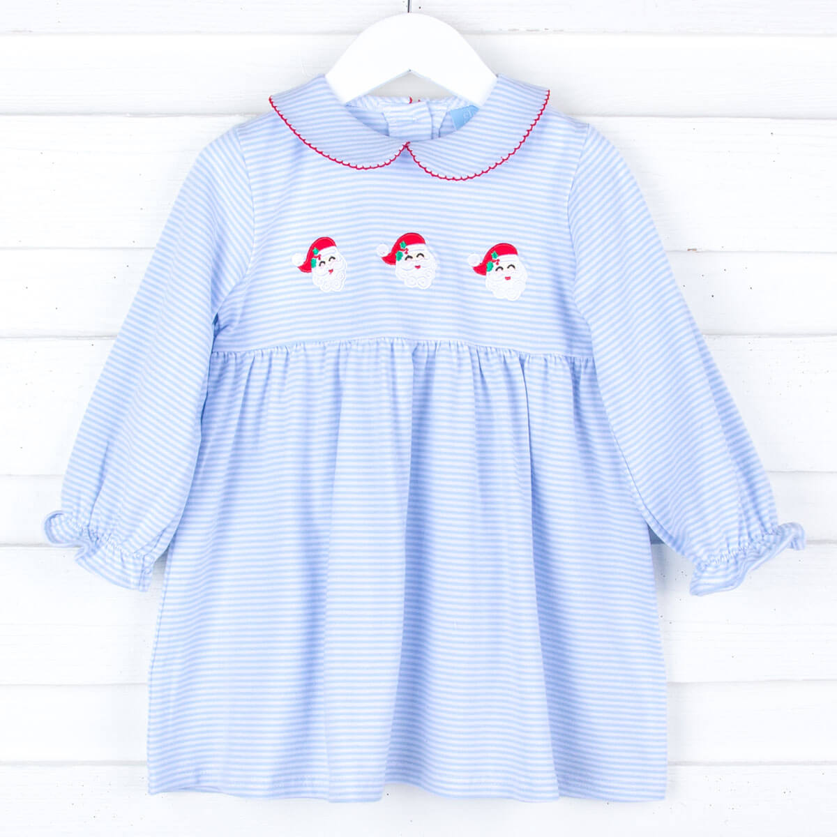 Celebrate the holiday season in our Happy Santa Light Blue Stripe Riley Dress. This Riley-style dress features three cheerful Santa appliques, a sweet collar with red trim, and long bishop sleeves for an extra charming touch.
