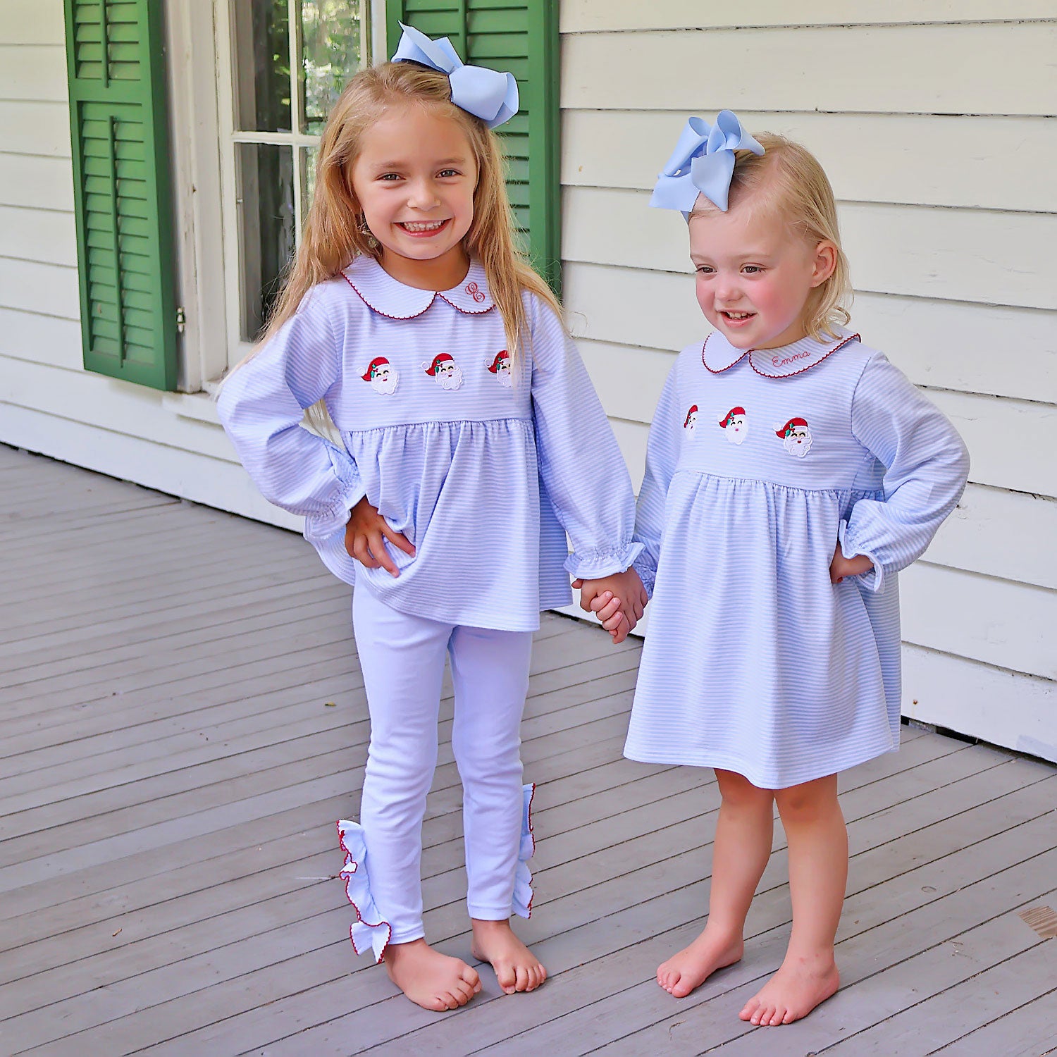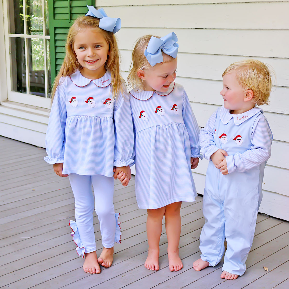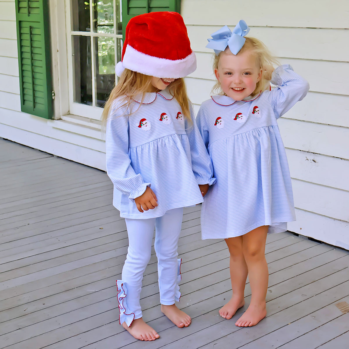 Celebrate the holiday season in our Happy Santa Light Blue Stripe Riley Dress. This Riley-style dress features three cheerful Santa appliques, a sweet collar with red trim, and long bishop sleeves for an extra charming touch.