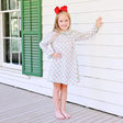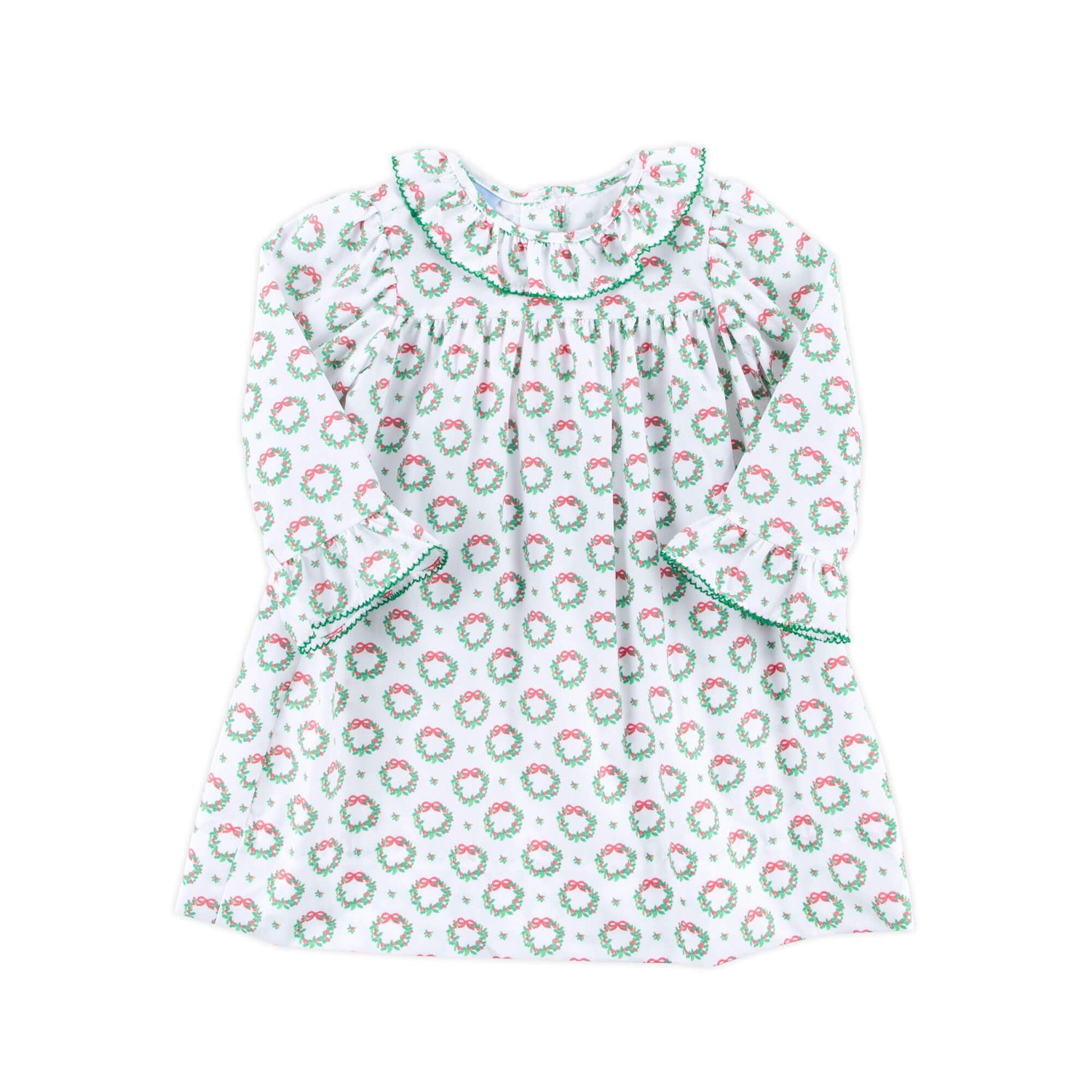 Celebrate Christmas in our Holiday Wreath White Print Ruffle Collared Dress. This charming dress features a Christmas wreath print, a ruffle collar and long sleeves with red ric rac trim, making it perfect for the festive season. A timeless choice for your holiday celebrations!