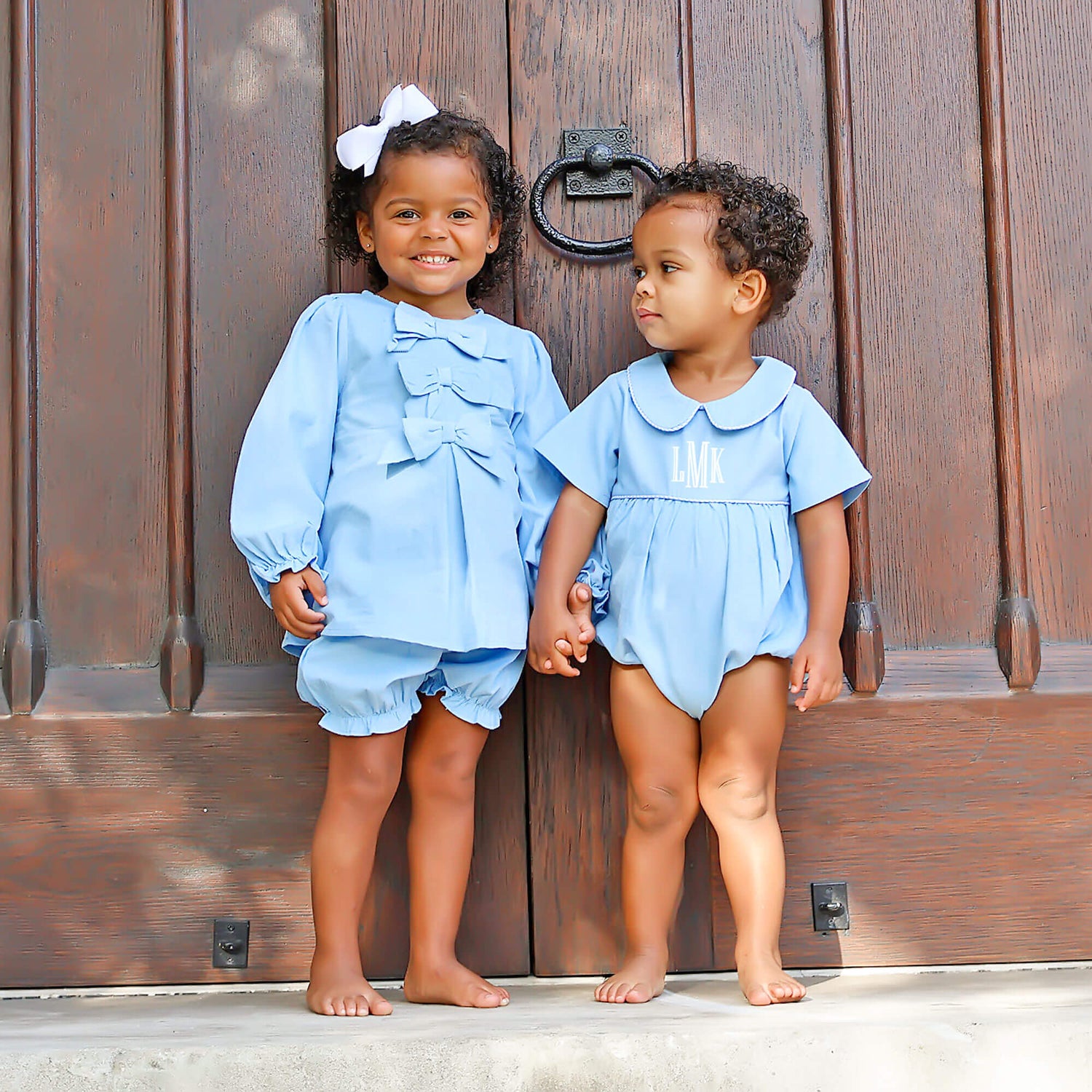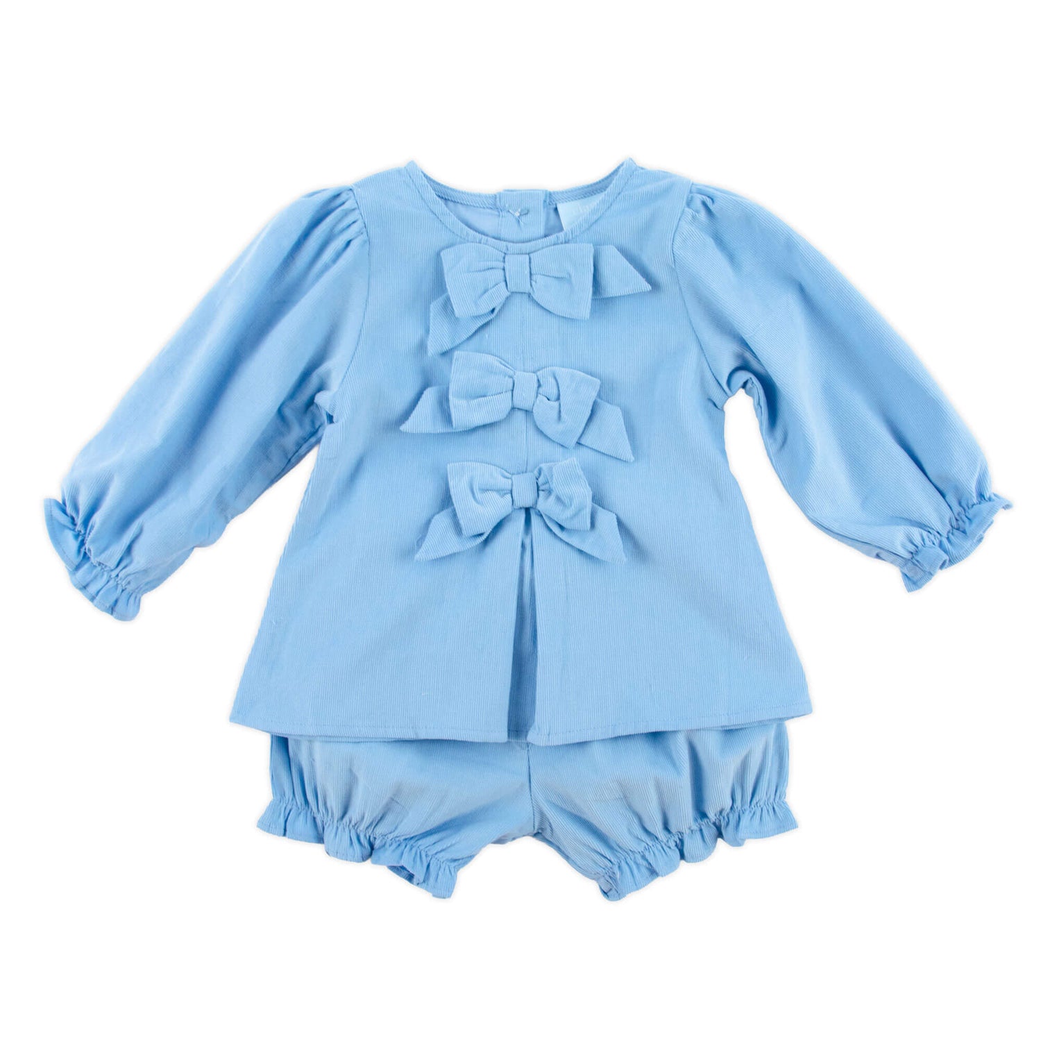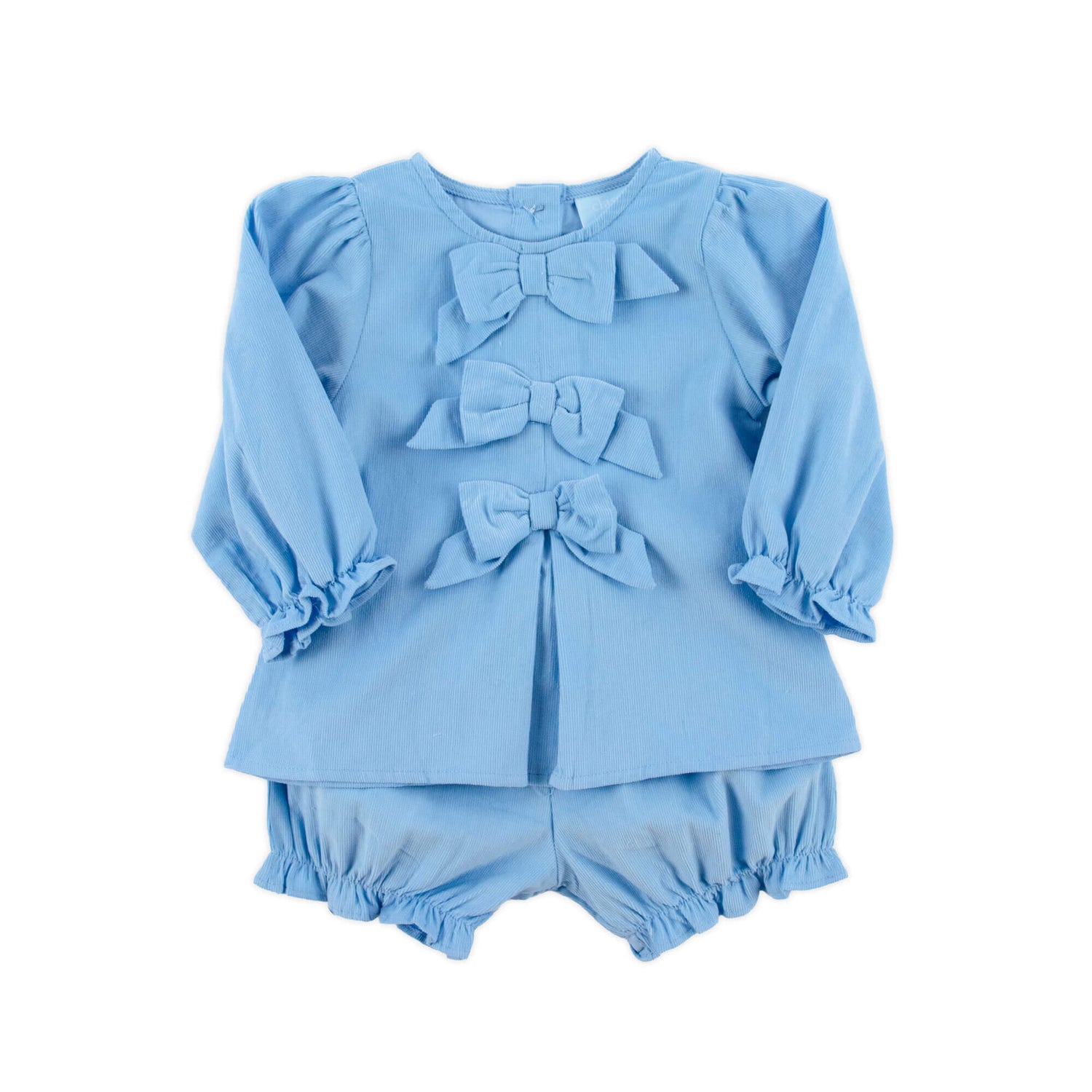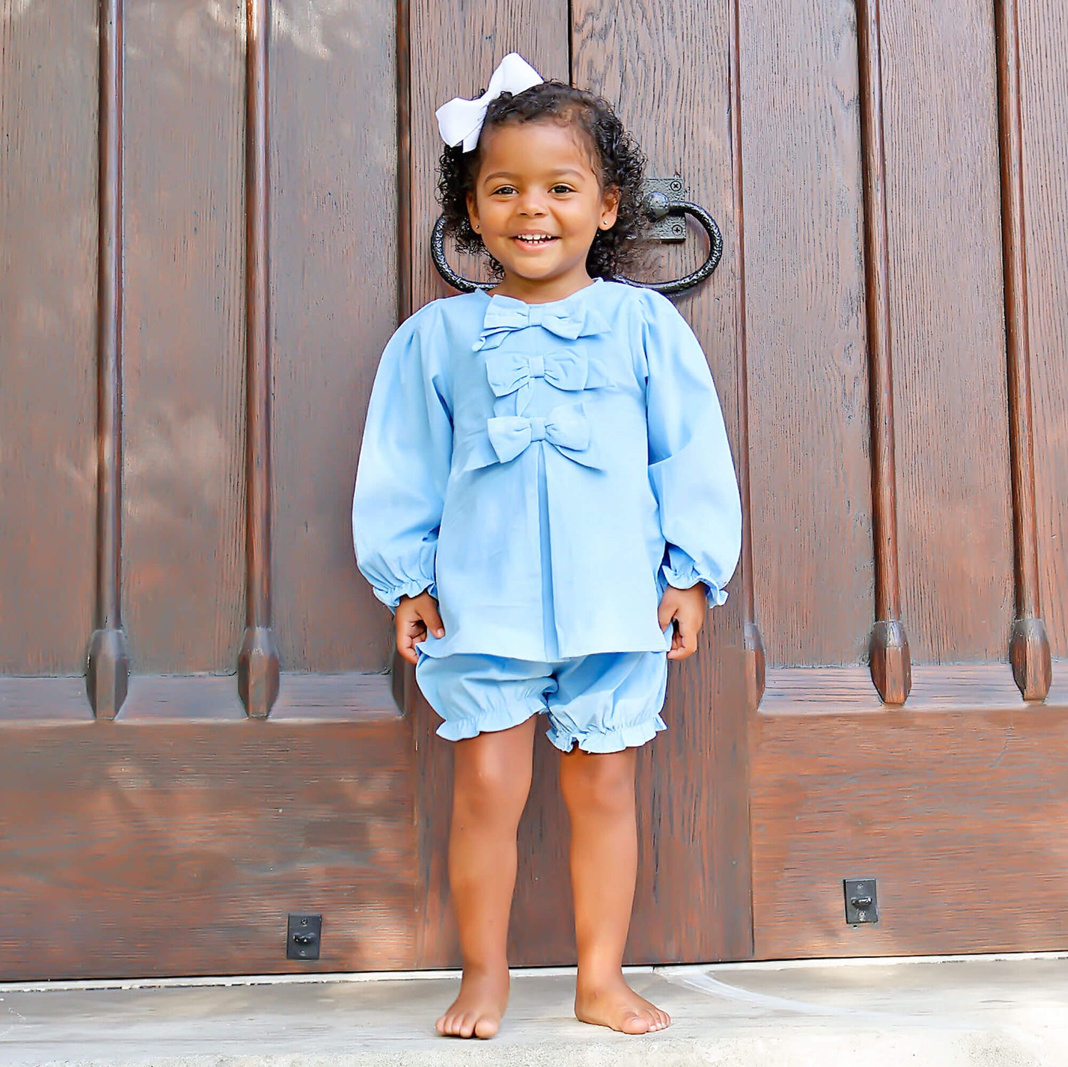 Elevate your little one's wardrobe with our Light Blue Corduroy Coco Bloomer Set, the perfect addition for the season! The long-sleeve top in light blue corduroy features charming blue gingham bows along the front. Paired with matching bloomer shorts, this outfit is sure to make your little one stand out.