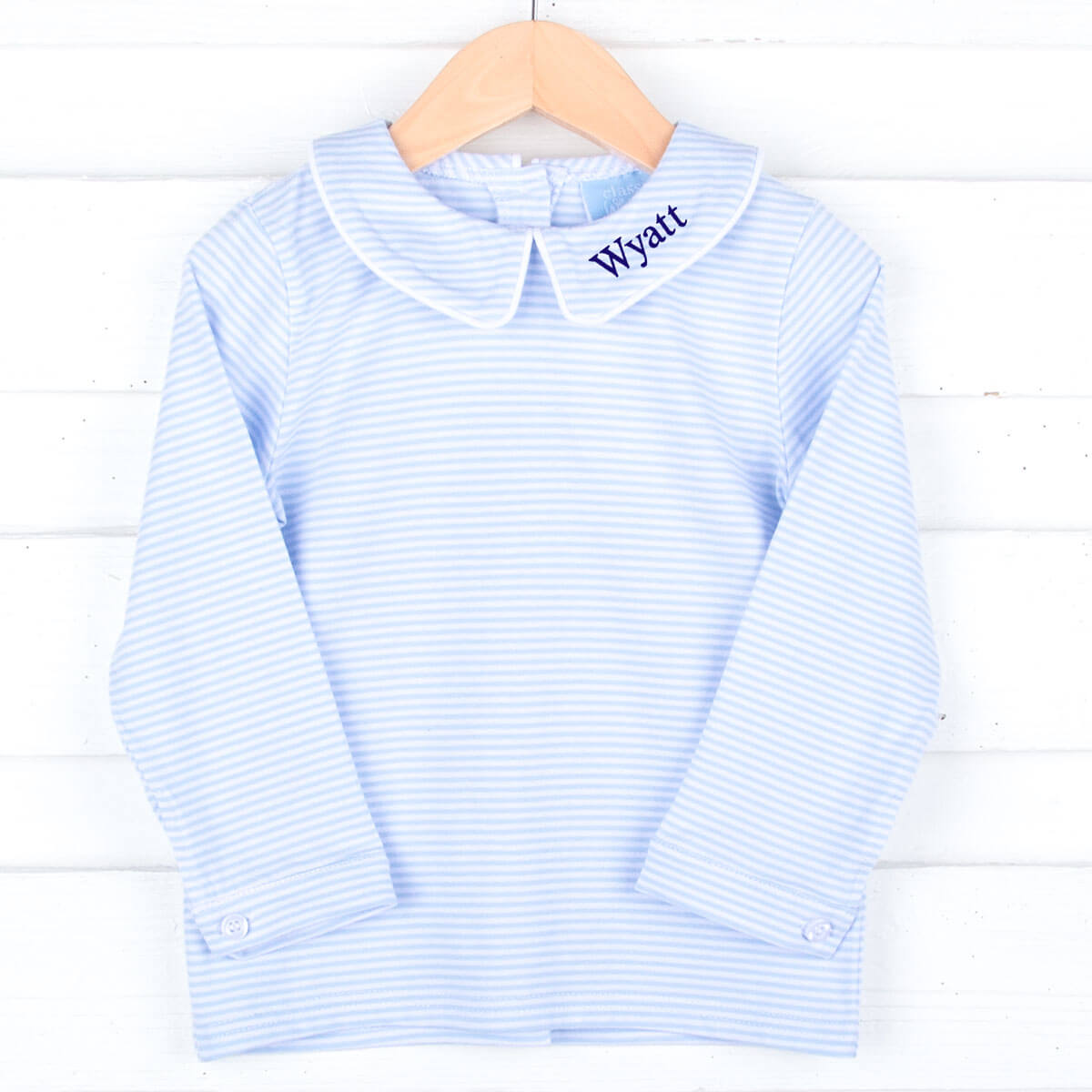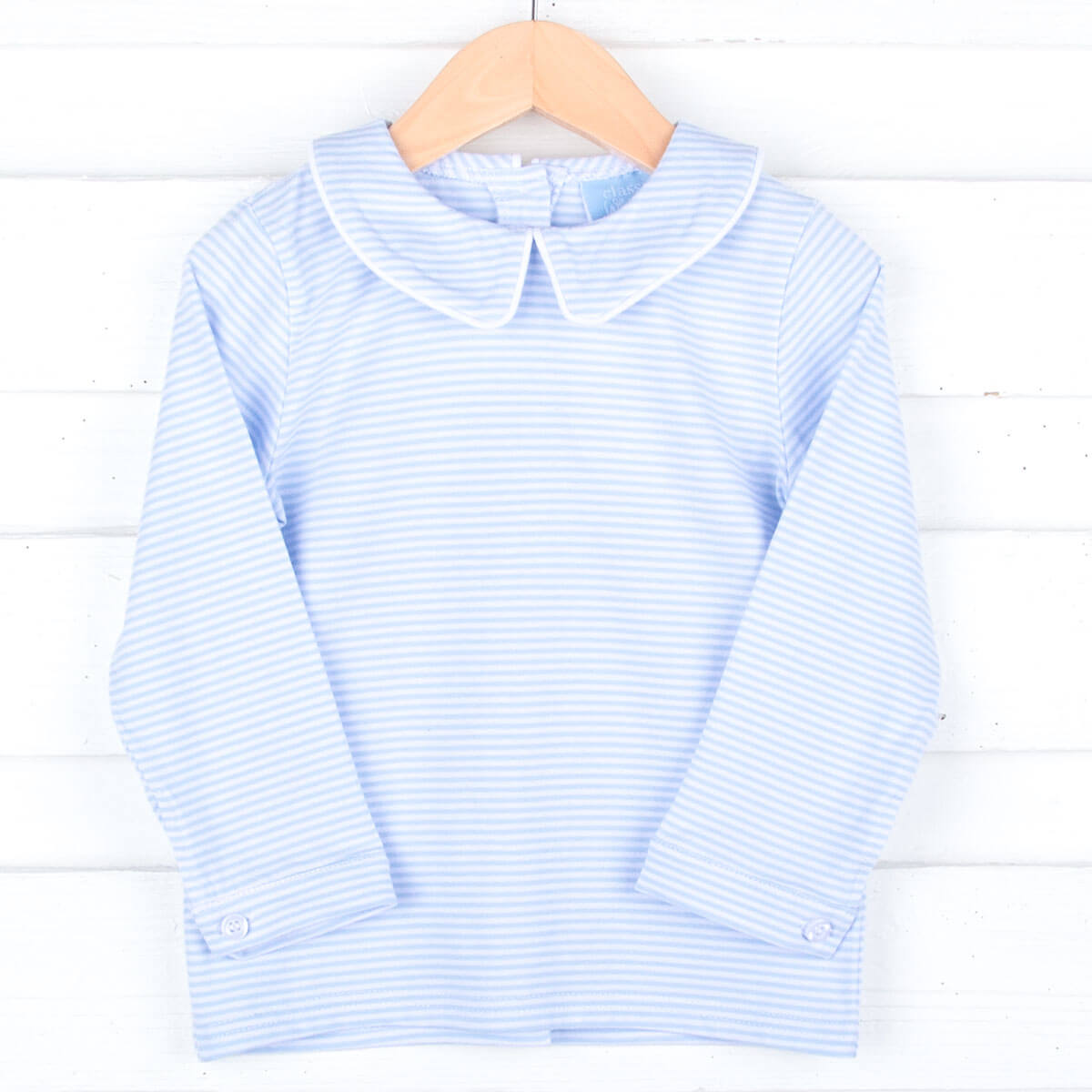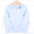 Celebrate the holiday season in our Light Blue Stripe Undershirt. This long sleeve undershirt with a sweet collar is perfect for layering to keep your little one warm during the chilly season. Pair it under one of our classic longalls for a cozy look. Add a monogram on the collar for a personalized touch.
