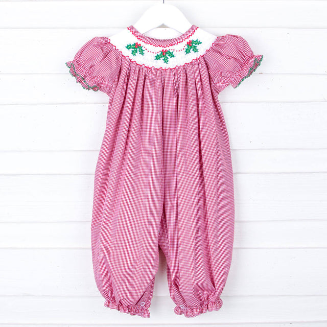 Ensure your little one is fashionably festive in this Mistletoe Magic Smocked Long Bubble. It features smocked mistletoe on red gingham and adorable bishop sleeves trimmed with green picot. Snaps in the stride ensure easy changes. Designed to make your little one stand out at any festive occasion!