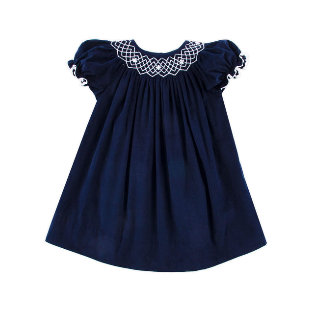 Get into the holiday spirit with this Navy Corduroy Smocked Bishop Dress. This festive navy corduroy dress features sweet white geometric smocking and classic bishop sleeves with white ric rac trim. Celebrate Christmas in style with this stunning outfit!