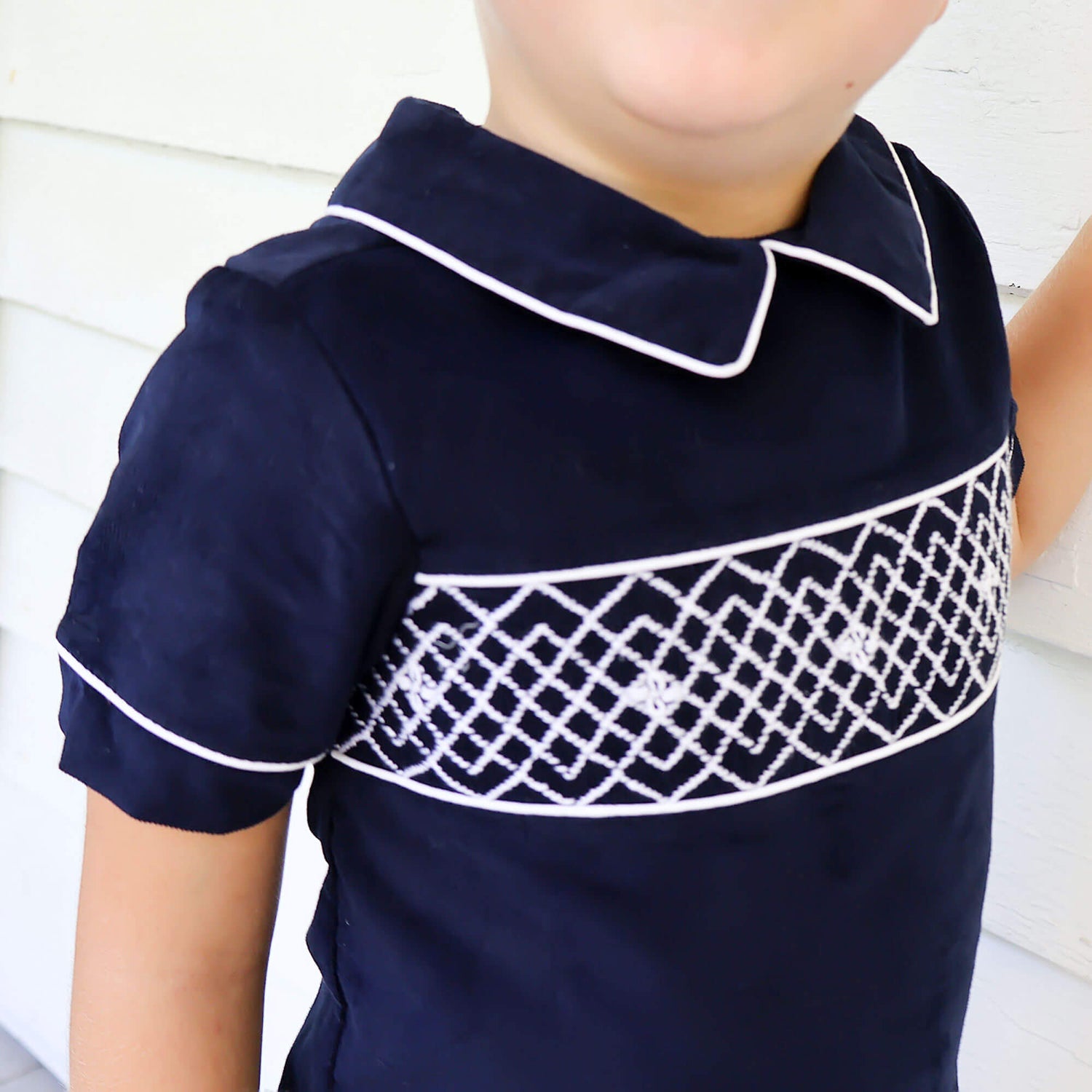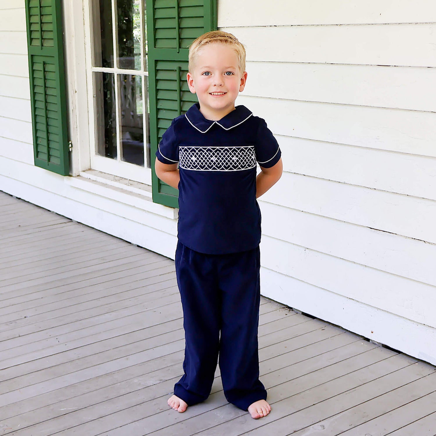 Get into the holiday spirit with this Navy Corduroy Smocked Collared Pant Set. The festive navy corduroy shirt features sweet white geometric smocking, an elegant collar, and short sleeves, making it perfect for celebrating Christmas in style. Paired with navy corduroy waistband pants, it's a stunning outfit for the holiday season!