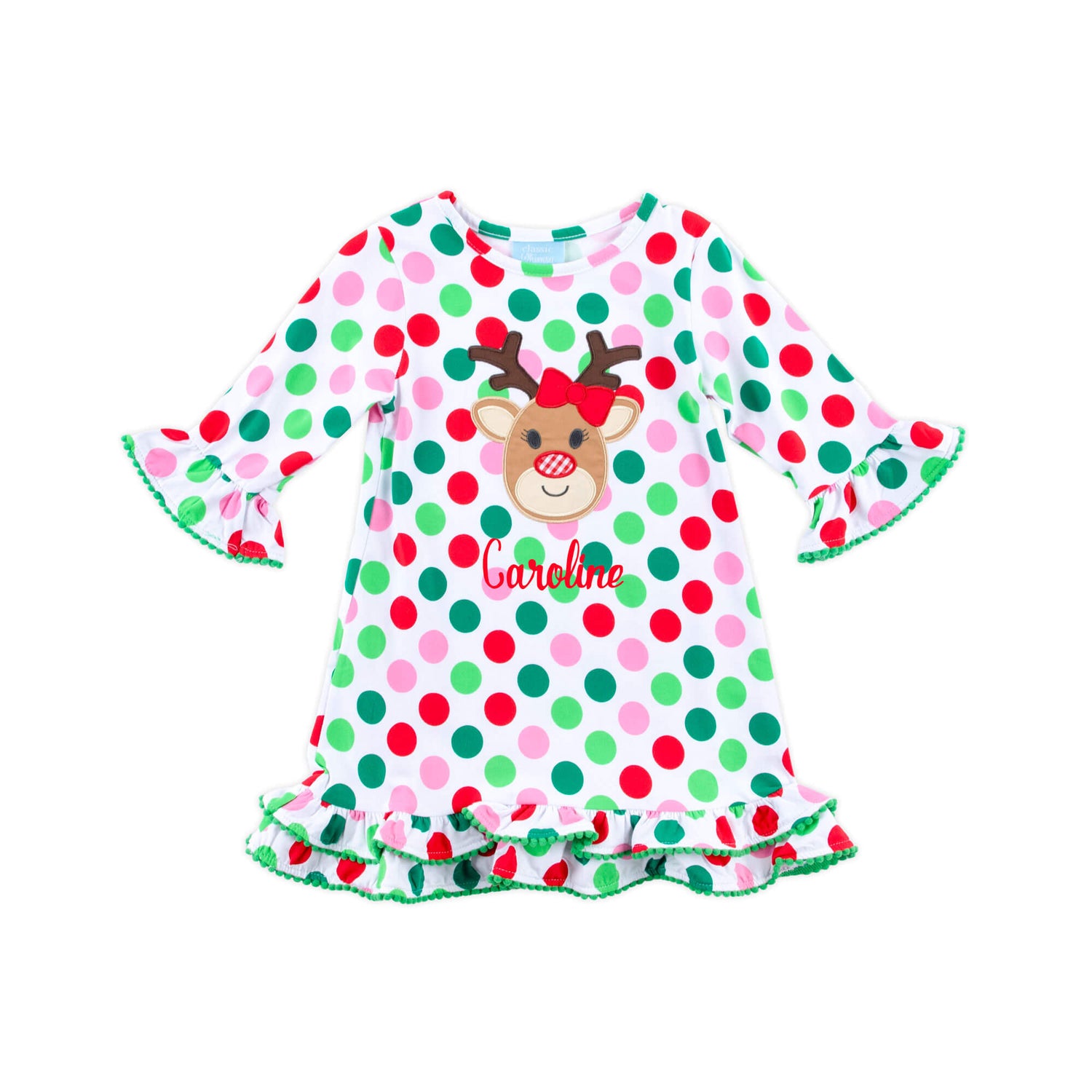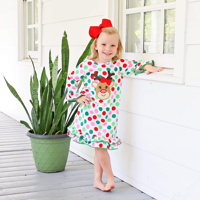 This Oh Deer Polka Dot Milly Dress is absolutely precious and perfect for Christmas! The multicolor polka dot knit dress features an adorable reindeer appliqué with a sweet red bow and green pom-pom trim. It's just right for holiday parties, playtime fun, and all the festive cuteness. Don’t forget to add a monogram for an extra special touch!