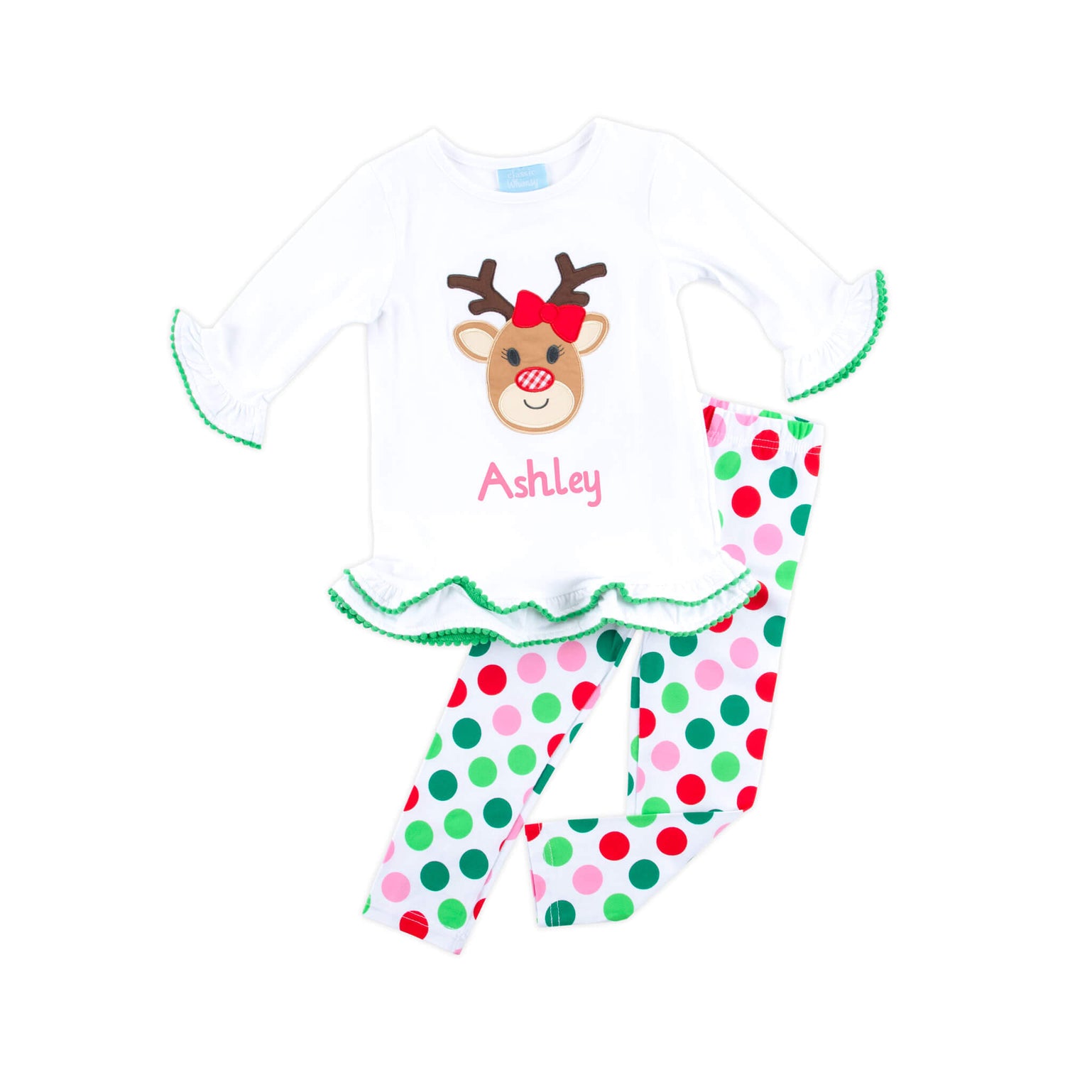 This Oh Deer Polka Dot Milly Legging Set is absolutely precious and perfect for Christmas! The white knit top features an adorable reindeer appliqué with a sweet red bow. Paired with multicolor polka dot leggings, it's just right for holiday parties, playtime fun, and plenty of festive cuteness. Don’t forget to add a monogram for an extra special touch!