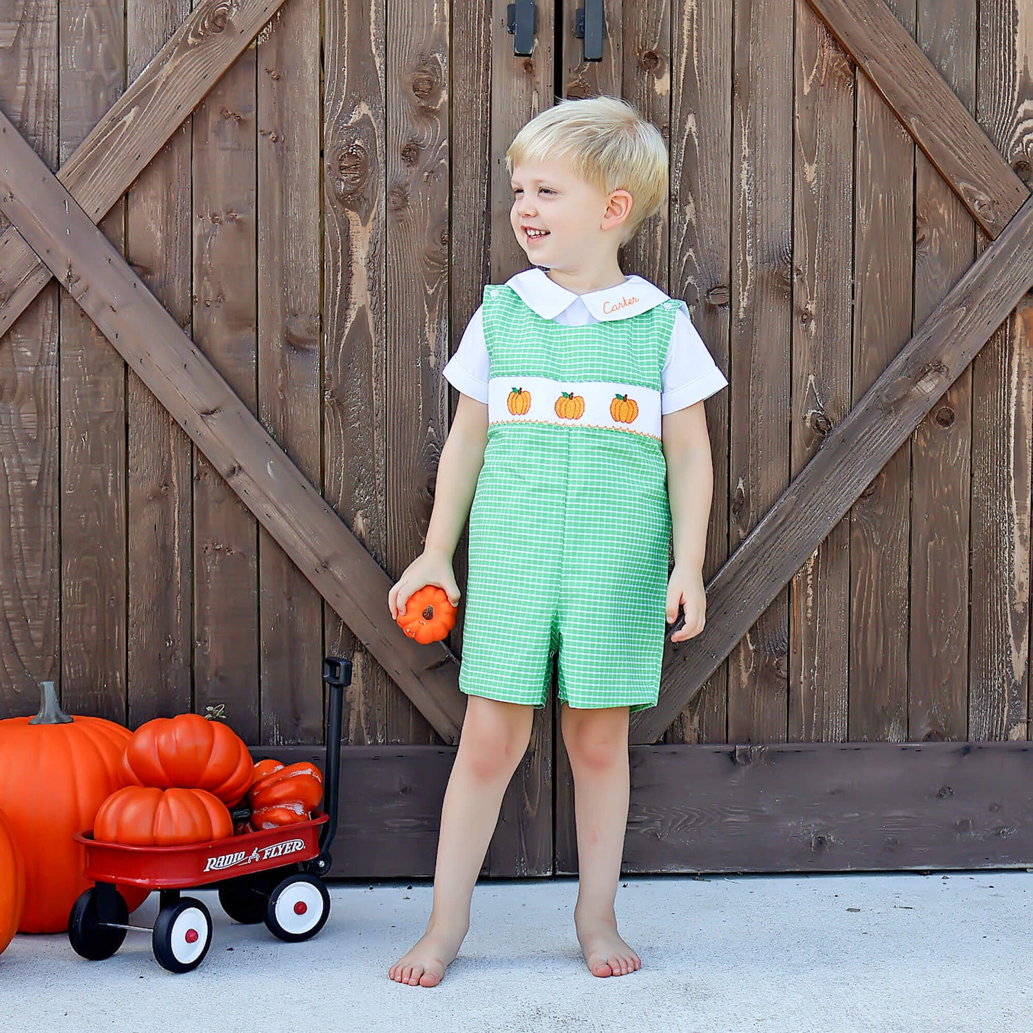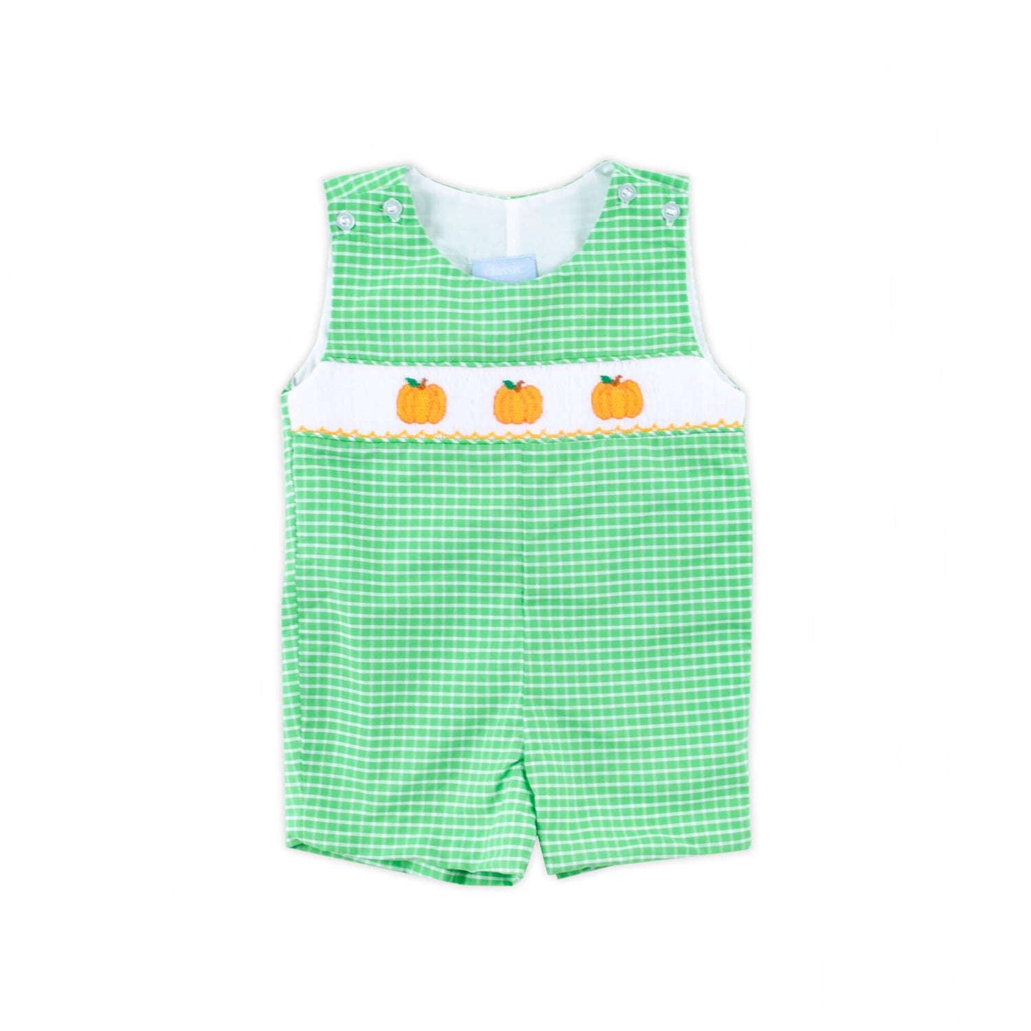 Pumpkin season is here, and your little one will be ready for all the fall fun in our Paradise Pumpkin Smocked Green Windowpane Jon Jon! Featuring sweet smocked pumpkins, this Jon Jon is perfect for pumpkin patch adventures and festive photo ops. Shoulder buttons and snaps in the stride make changes quick and easy!