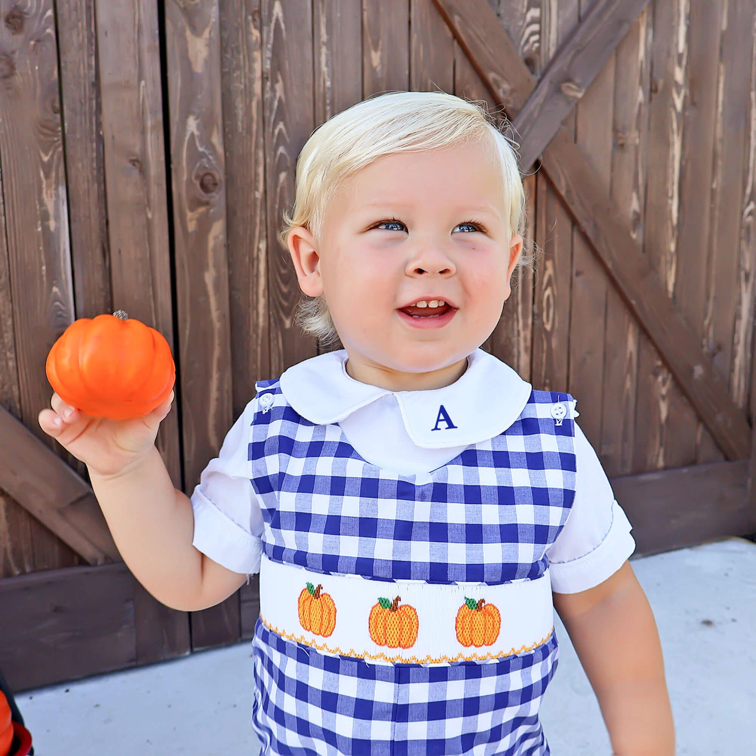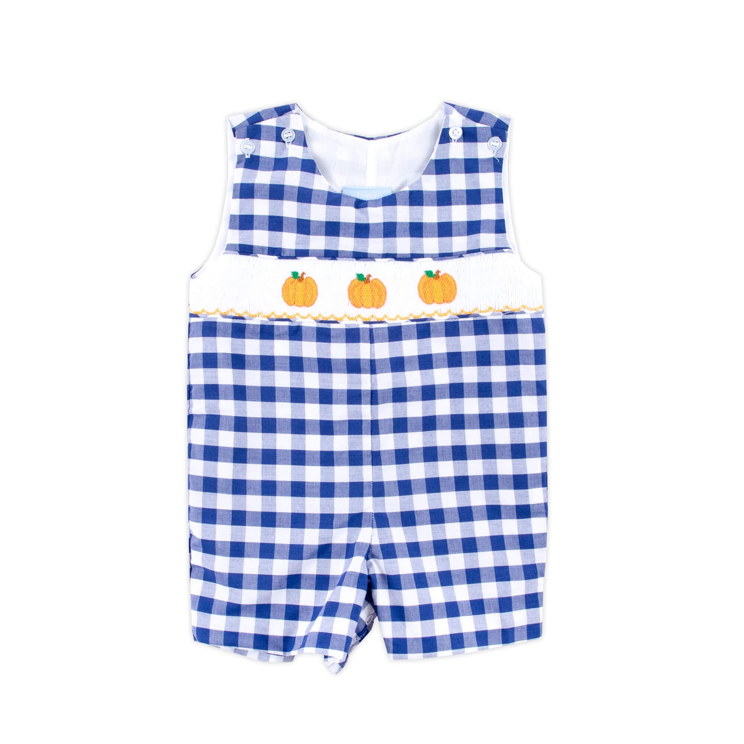 Pumpkin patch adventures are calling in our oh-so-cute Pumpkin Smocked Navy Check Jon Jon! Featuring sweet hand-smocked pumpkins, shoulder buttons, and easy snaps in the stride, this Jon Jon is perfect for fall fun and picture-perfect moments!