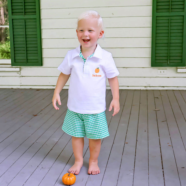 It's pumpkin season, and your little one will look adorable in our Green Check Pumpkin Polo Short Set! This white polo features a sweet embroidered pumpkin. The set includes green gingham check shorts, perfect for all your fall outings!