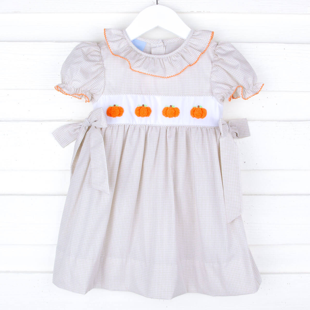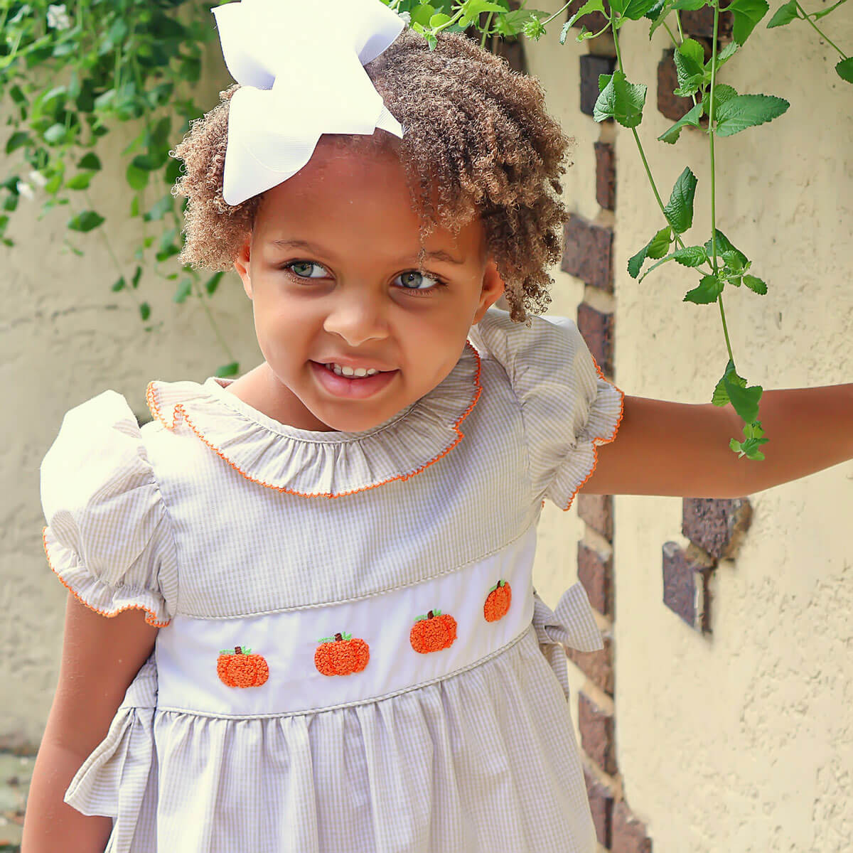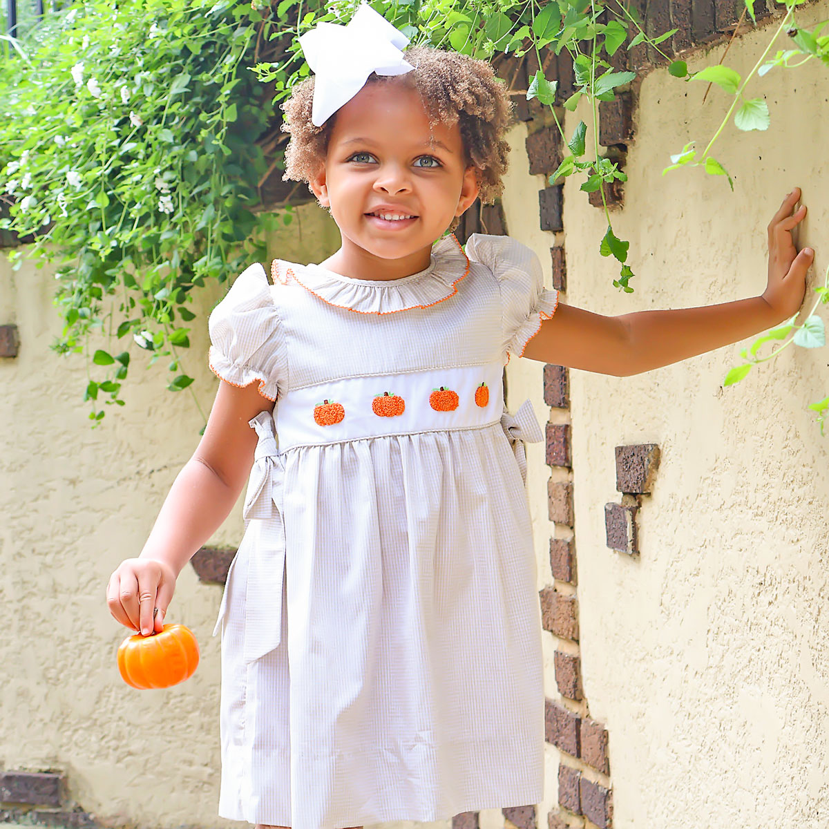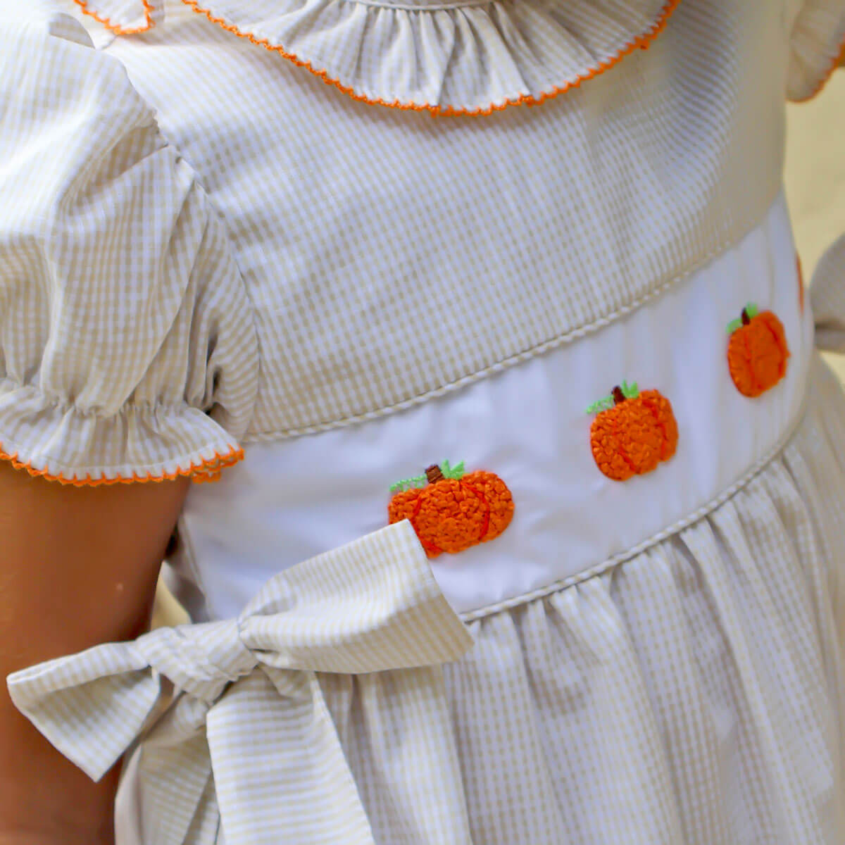 This Pumpkin French Knot Tan Gingham Beverly Dress is made for picture-perfect pumpkin patch photos! This charming Beverly-style dress features adorable French knotted pumpkins and two sweet side tie bows, ready for all your fall adventures.