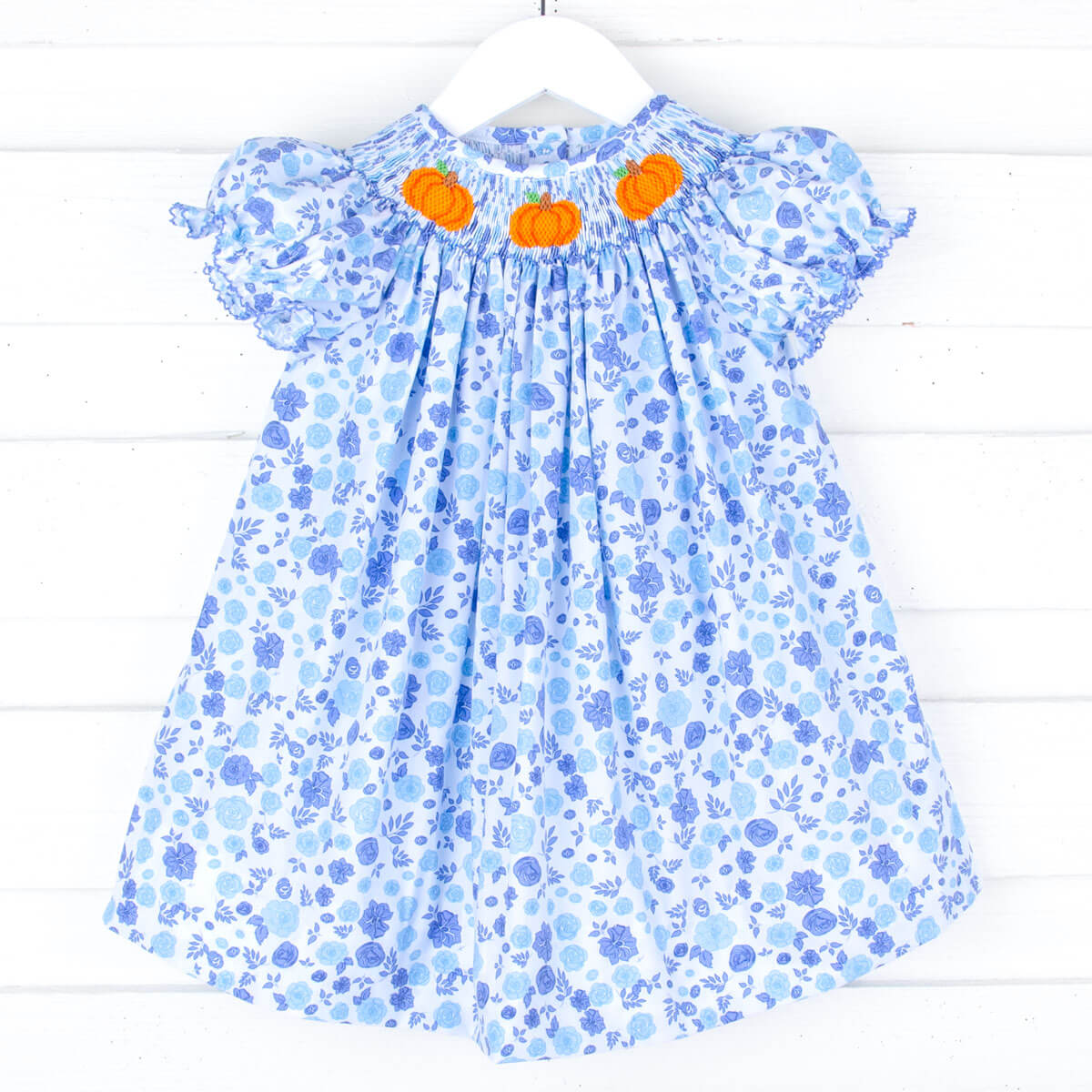 It's pumpkin season, and our Pumpkin Patch Blue Floral Smocked Bishop Dress is ready to be picked! This adorable blue floral dress features smocked pumpkins and bishop sleeves with playful blue trim, perfect for all your little one's autumn adventures.