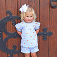 It's pumpkin season, and your little one will look adorable in our Pumpkin Schiffli Light Blue Gingham Eleanor Short Set! The Eleanor-style top in light blue gingham features sweet custom embroidered pumpkins, bishop sleeves, and a blue ric-rac trim. The set is coordinated with light blue gingham shorts.