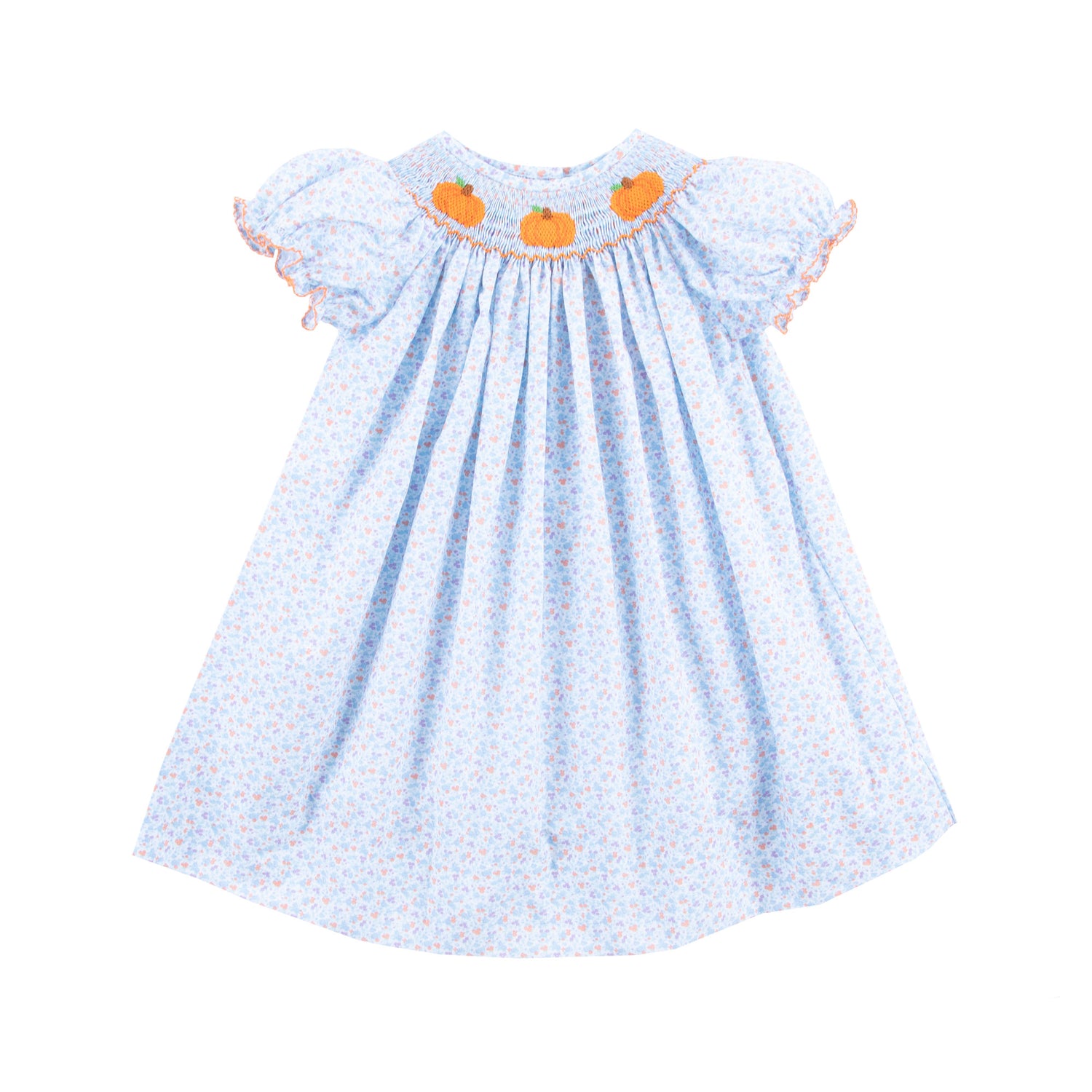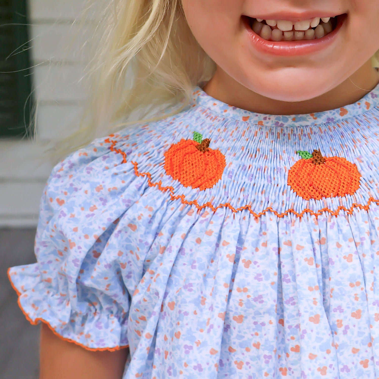 Say hello to fall in the sweetest way with our Pumpkin Smocked Floral Bishop Dress! This adorable dress features a charming fall floral print, playful bishop sleeves trimmed in orange picot, and the cutest smocked pumpkins across the neckline. It’s a must have for pumpkin patch adventures, fall photos, and all your autumn outings!