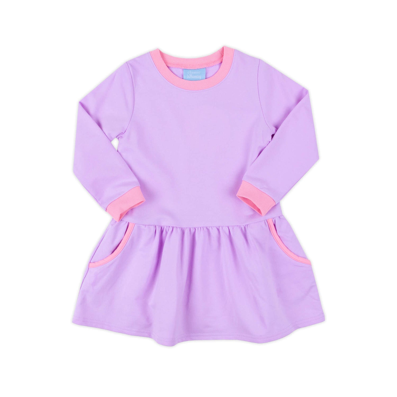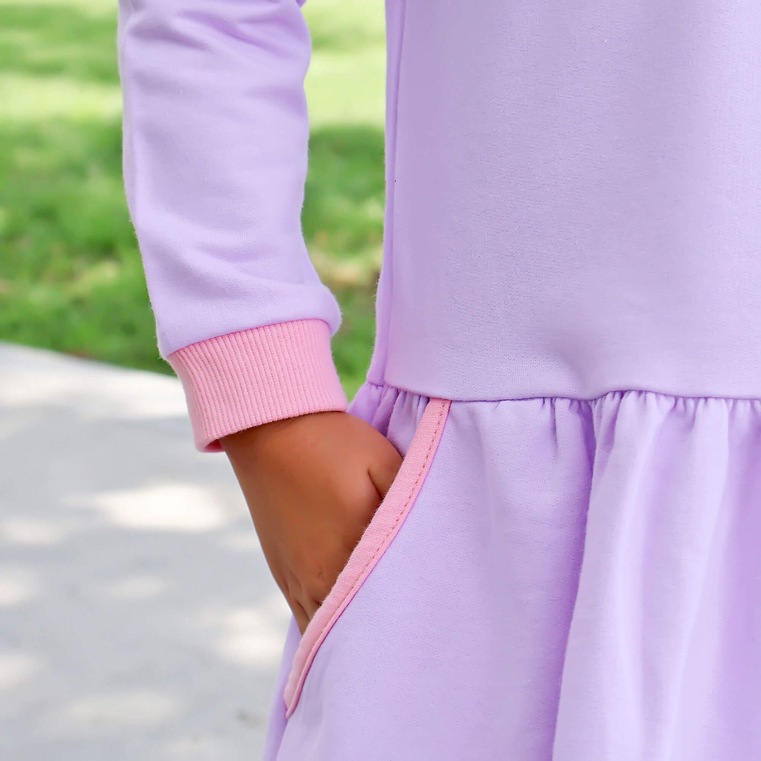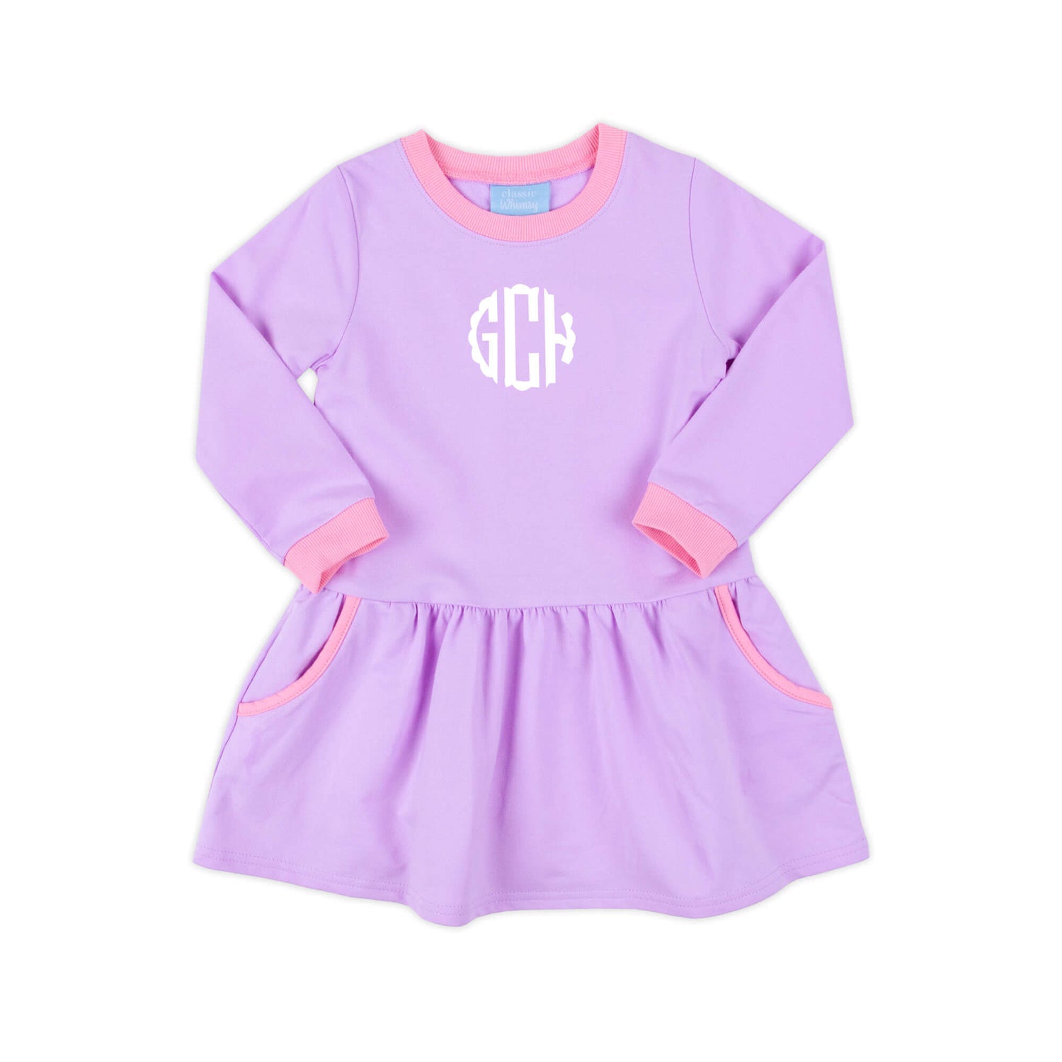Get ready for fun and twirls in our adorable Purple Izzy Dress! Made from soft purple French terry, this long sleeve dress features sweet pink ribbing and handy front pockets for all her little treasures. Perfect for playtime adventures and everyday magic! Add a monogram to make it extra special and all hers.