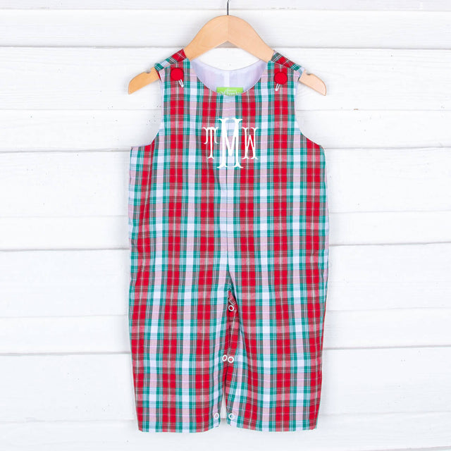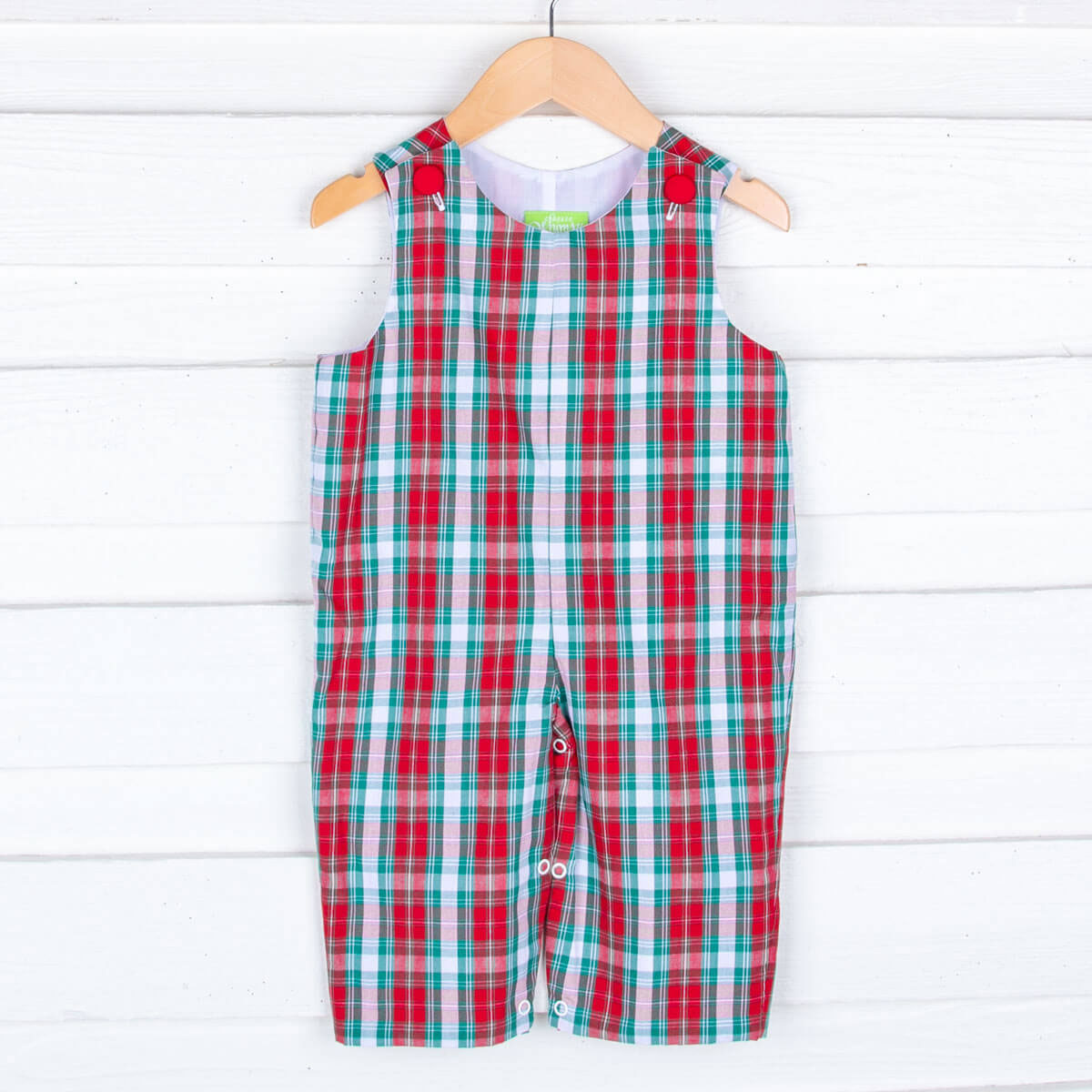 Celebrate Christmas in our classic Red and Green Plaid Boy Longall. This charming longall features festive red and green plaid, making it perfect for visits to Santa and hanging ornaments on the tree. A timeless choice for your holiday celebrations! Convenient shoulder buttons and stride snaps ensure easy changes. Add a monogram to make this outfit even more special.
