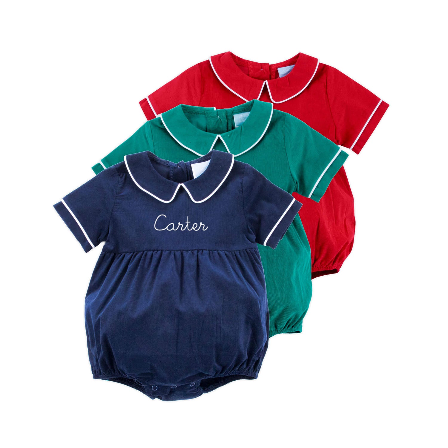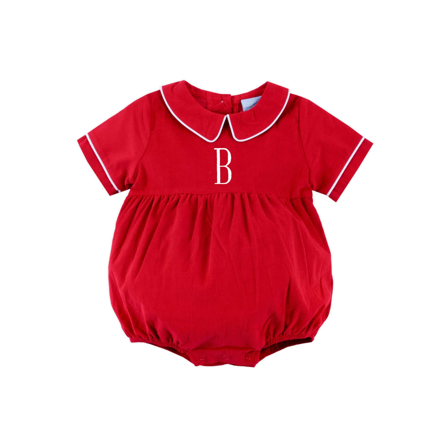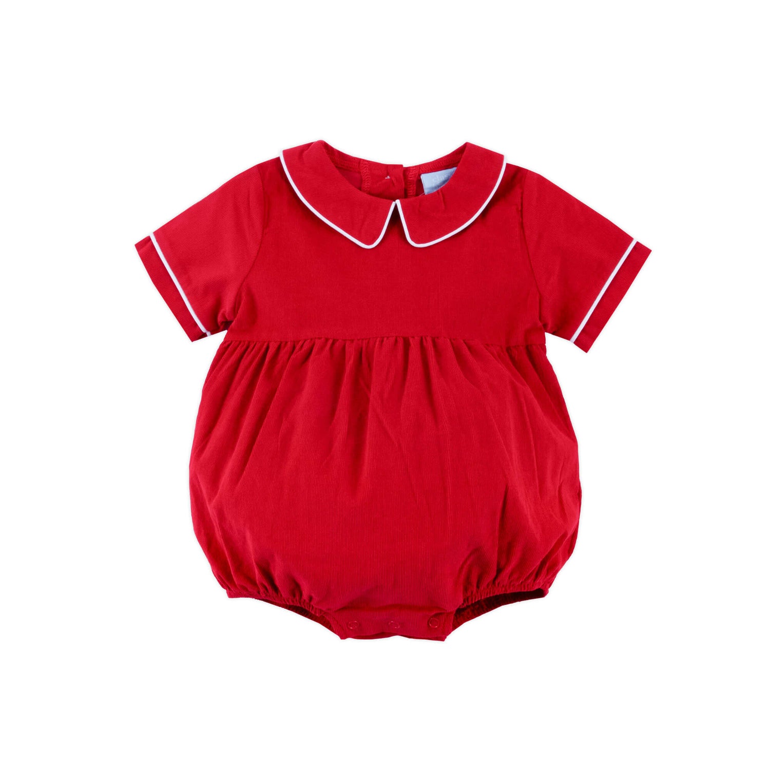 This Corduroy Collared Bubble is perfect for Christmas gatherings. This festive corduroy bubble features an elegant collar and short sleeves with white piping trim, making it perfect for visits to Santa and hanging ornaments on the tree. A timeless choice for your holiday celebrations! Convenient snaps in the stride ensure easy changes. Add a monogram to make this outfit even more special.