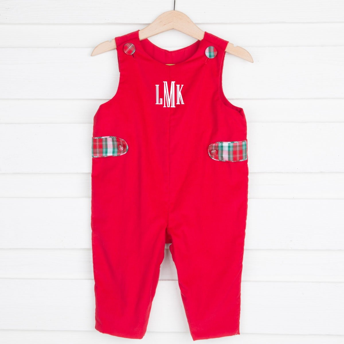 Celebrate Christmas in our classic Red Corduroy Longall with Plaid Tabs. This charming longall features soft red corduroy and plaid side tabs, making it perfect for visits to Santa and hanging ornaments on the tree. A timeless choice for your holiday celebrations! Convenient shoulder buttons and stride snaps ensure easy changes. Add a monogram to make this outfit even more special. Coordinates perfectly with sibling matching items in our Red & Green Plaid collection.