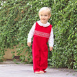 Get into the holiday spirit with this Red Corduroy Smocked Geo Longall. This festive red corduroy longall features sweet white geometric smocking, making it perfect for celebrating Christmas in style. Designed with shoulder buttons and snaps along the stride for easy changes, it's a stunning outfit for the holiday season!