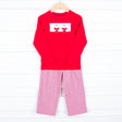 Get your little one ready for the festive season with this Santa Is Coming Smocked Pant Set, perfect for Christmas cards, holiday parties, or a special visit with Santa. This charming red long shirt features smocked Santa Claus and is beautifully coordinated with red gingham pants.