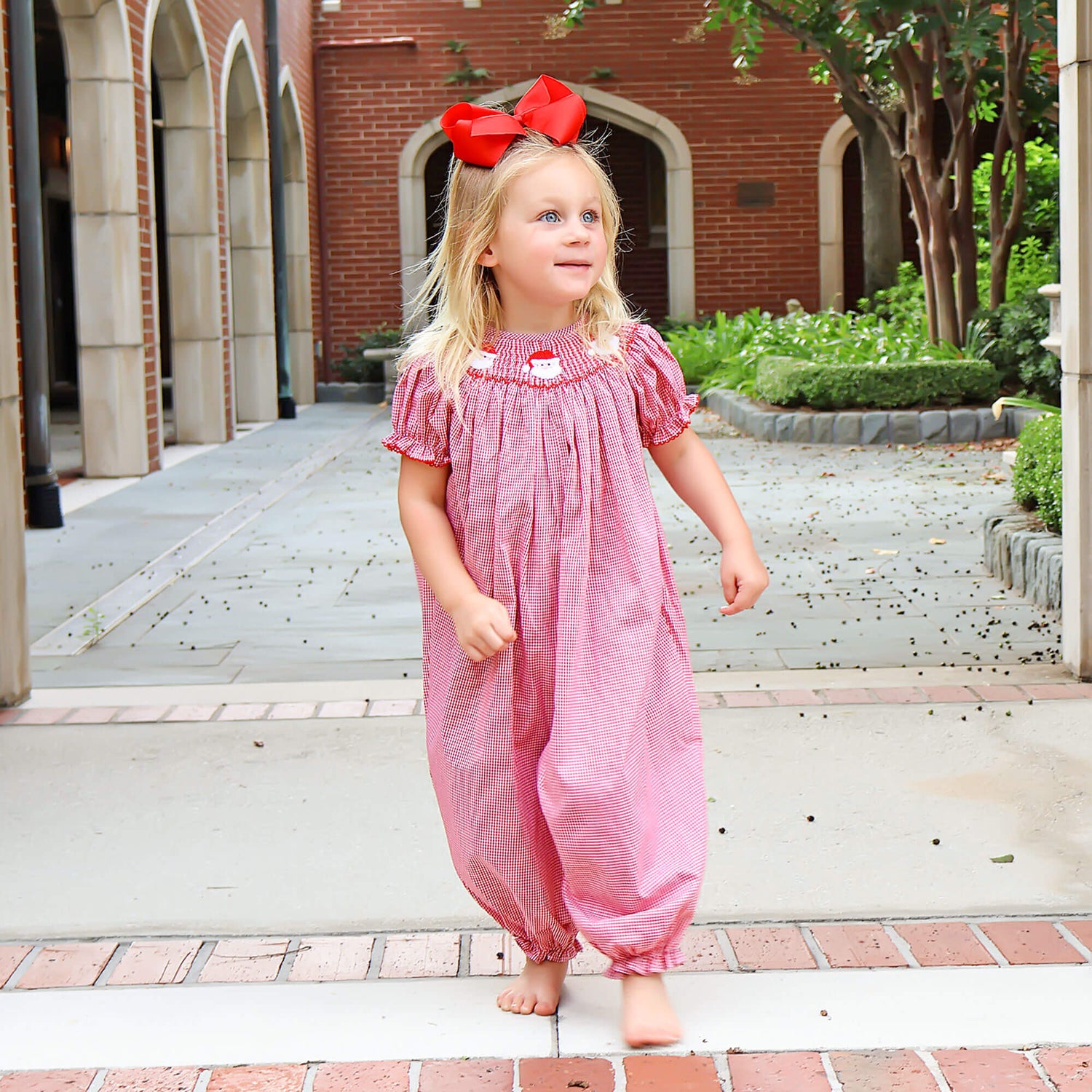 Sleigh bells are ringing! Our Santa's Favorite Smocked Long Bubble is here to spread holiday cheer. This charming red gingham bubble features adorable smocked Santas across the neckline and bishop sleeves, making it perfect for the most wonderful time of the year! Snaps in the stride ensure easy changes, so your little one can continue enjoying the holiday fun
