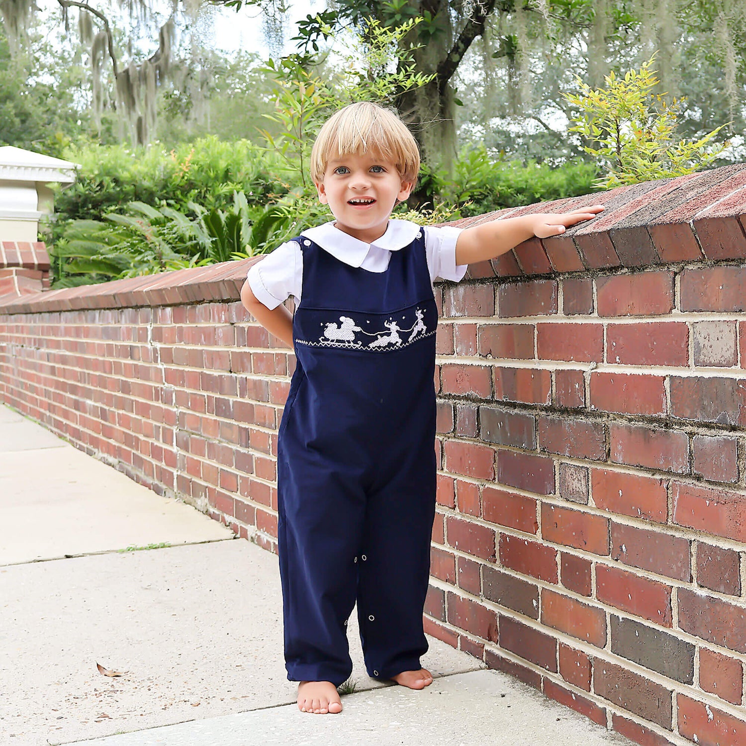 Get in the Holiday spirit with our Santa Sleigh Smocked Longall Navy Corduroy. This longall features a smocked Santa sleigh on a navy corduroy fabric. With snaps in stride for easy changing, perfect for this Holiday season!