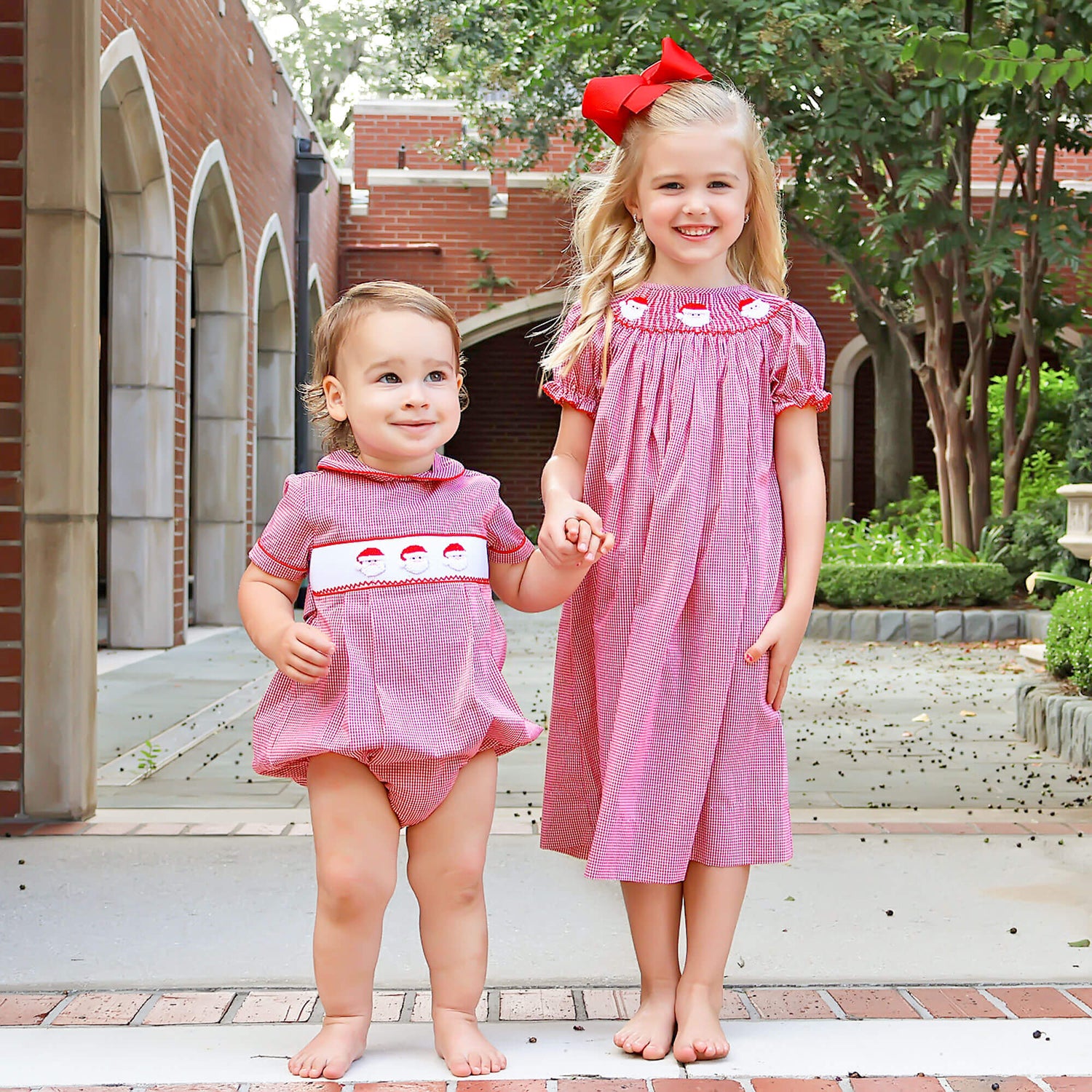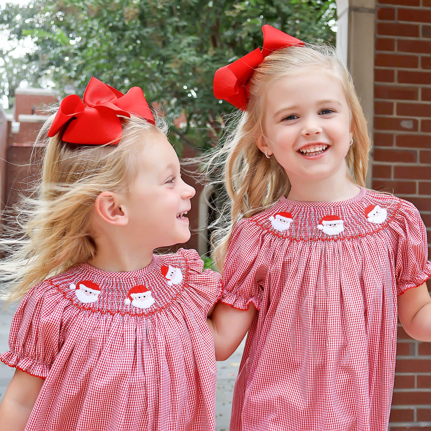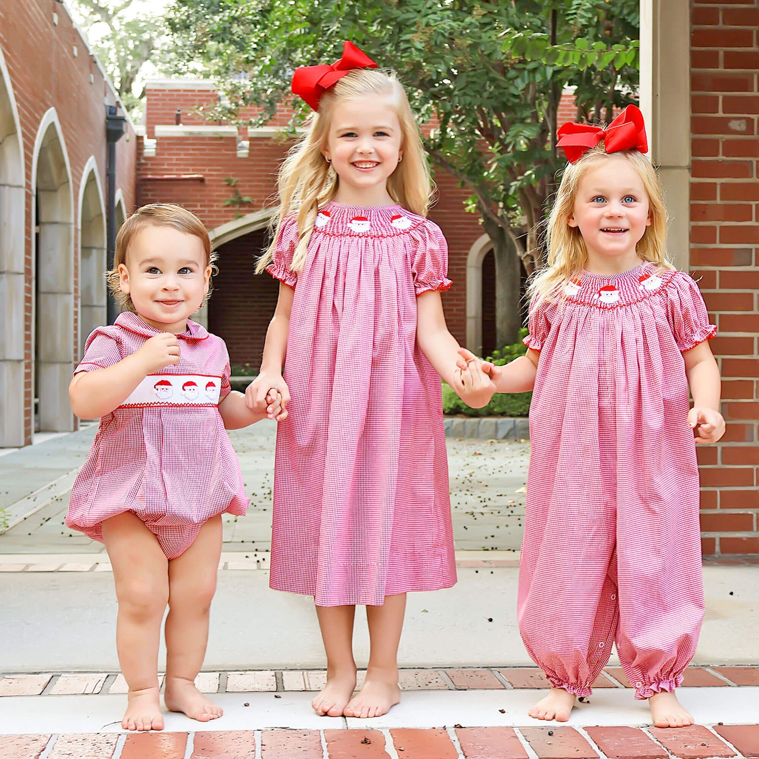 Sleigh bells are ringing! Our Santa's Favorite Smocked Bishop Dress is ready to bring holiday cheer. This charming red gingham dress features adorable smocked Santas across the neckline, perfect for the most wonderful time of the year! Bishop sleeves trimmed with red picot add an extra touch of festive charm.