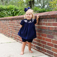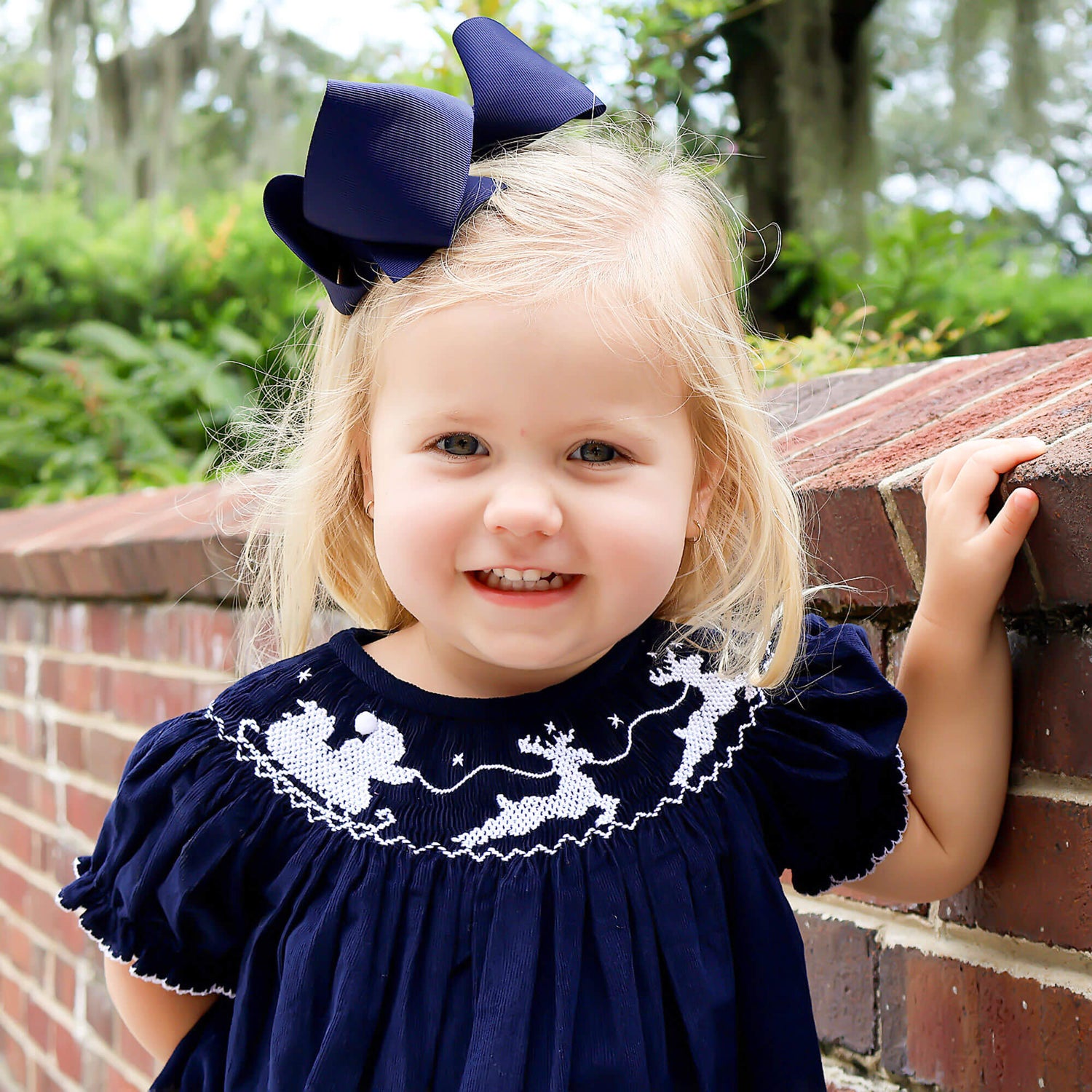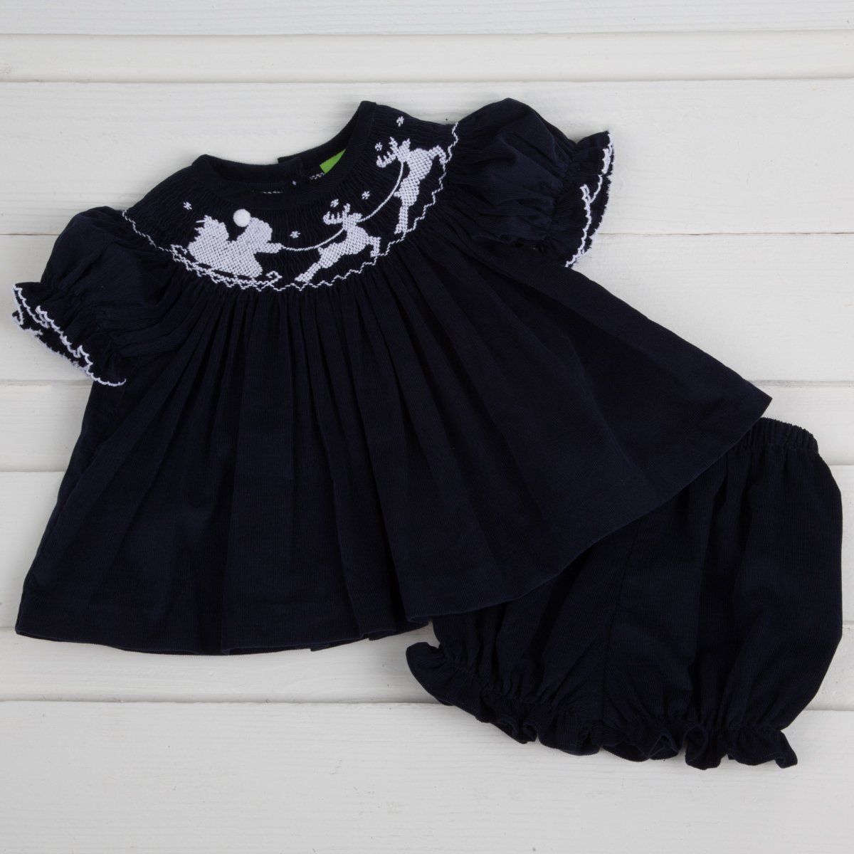 Get in the Holiday spirit with our Smocked Santa Sleigh Bloomer Set Navy Corduroy. The gorgeous top features bishop sleeves with white picot trim, and a smocked Santa sleigh on a navy corduroy fabric. Paired with matching bloomer shorts, perfect for this Christmas!