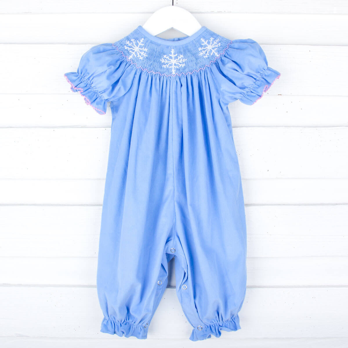 Our Snowflake Smocked Blue Corduroy Bishop Long Bubble is here to spread holiday cheer. This light blue corduroy long bubble features smocked white snowflakes and bishop sleeves accented with pink picot trim. Snaps in the stride ensure easy changes, so your little one can keep enjoying the holiday fun.