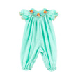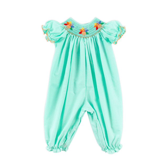 Get your little one ready for your family gathering this Thanksgiving in our Turkey Smocked Mint Polka Dot Long Bubble! This mint polka dot bubble features bishop sleeves with orange picot trim, and adorable smocked turkeys. With snaps in stride for easy changing.