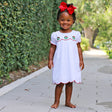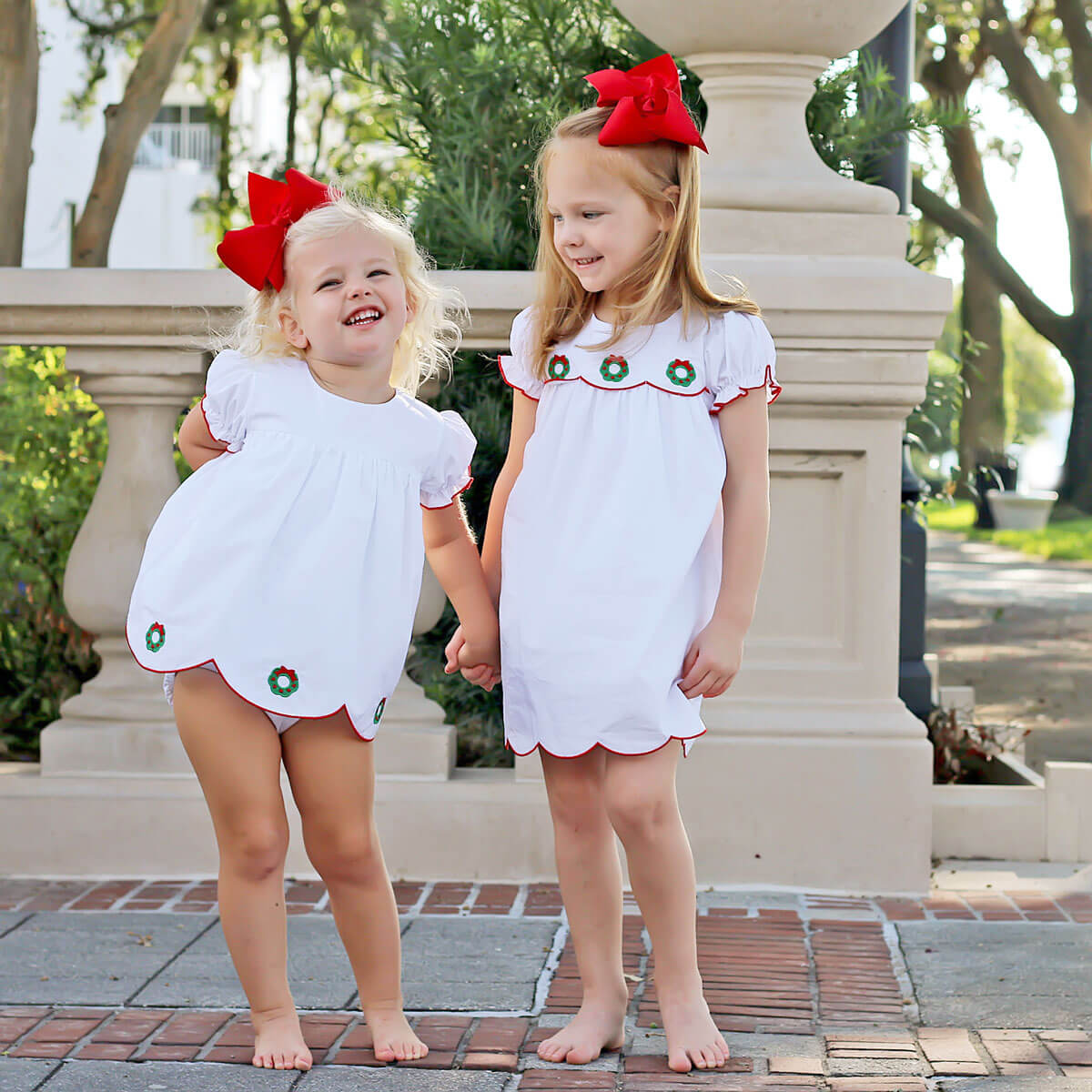 Get into the festive spirit with our Christmas Wreath Amelia Dress. This charming dress features an embroidered Christmas wreath on solid white fabric, cute bishop sleeves, and a scalloped hem with red trim.
