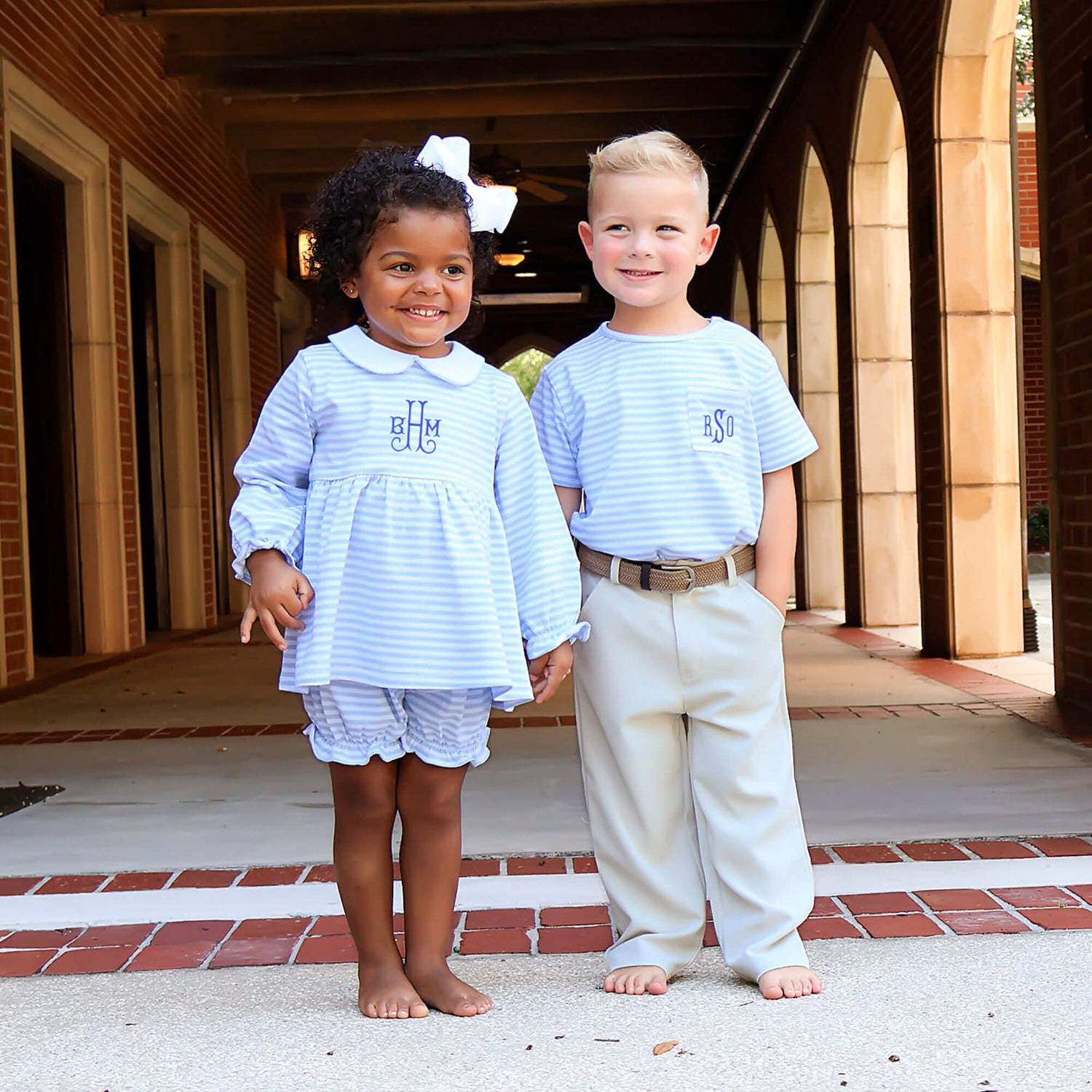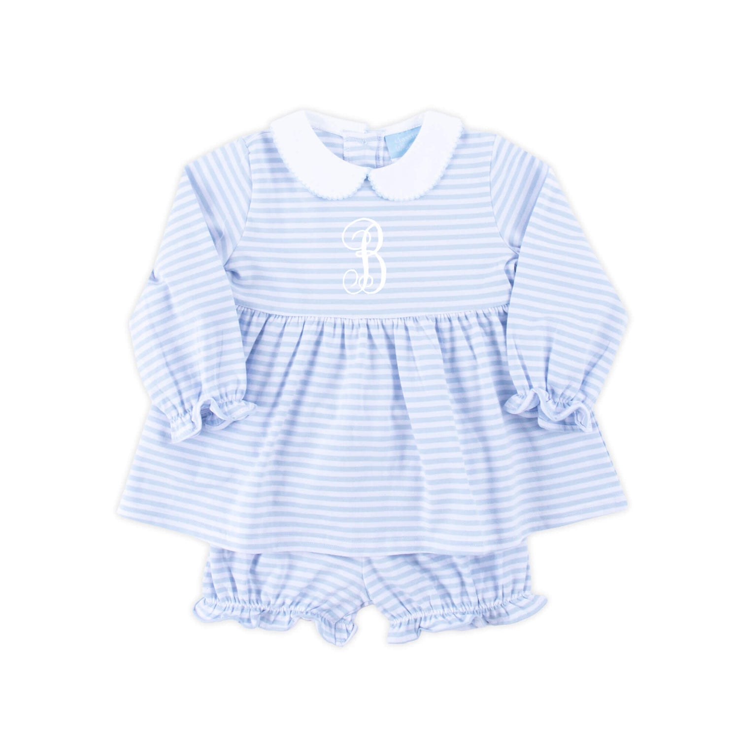 Your little girl will adore wearing the French Blue Stripe Riley Bloomer Set! The Riley-style top, designed in a light blue stripe knit print, features a charming white collar with light blue picot trim, and long bishop sleeves. Paired with matching light blue stripe bloomers, this set is as sweet as can be. Add a monogram for an extra-special touch. It's the perfect outfit for any sweet adventure!