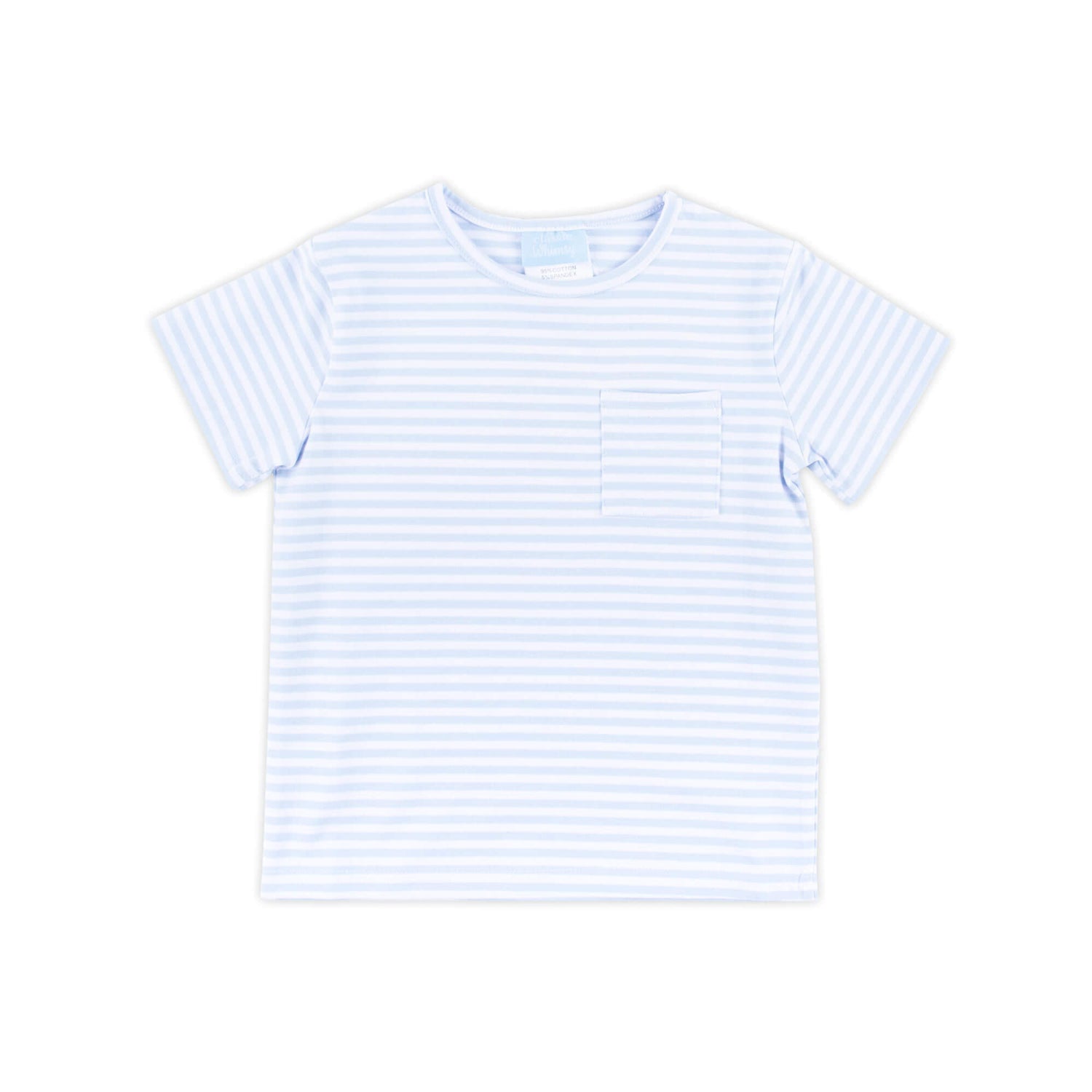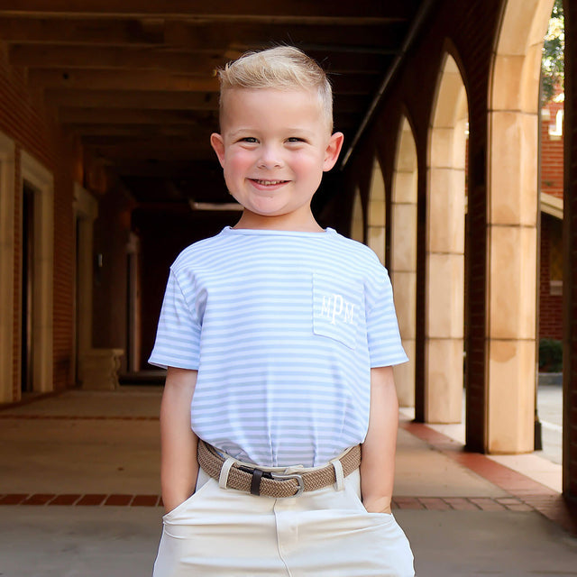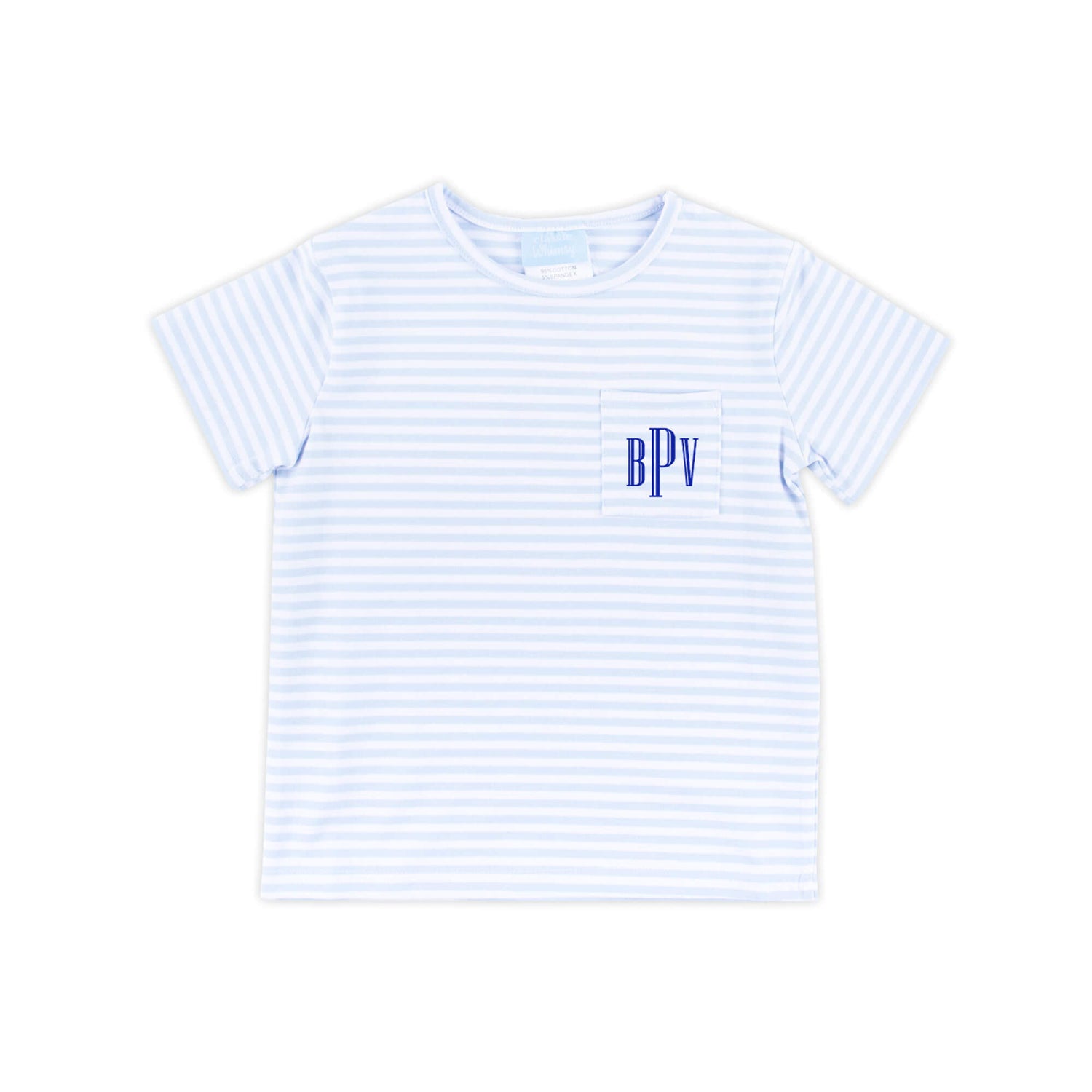 Dress up for playtime in our French Blue Stripe Short Sleeve Pocket Shirt. This classic knit stripe shirt features timeless style and includes a convenient side pocket, allowing you to mix and match effortlessly with your favorite bottoms. Personalize this shirt with a monogram.