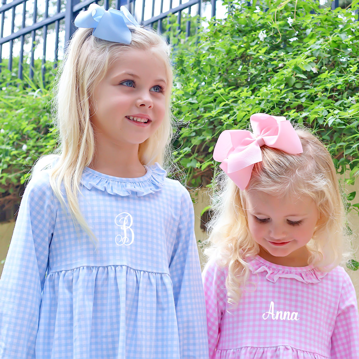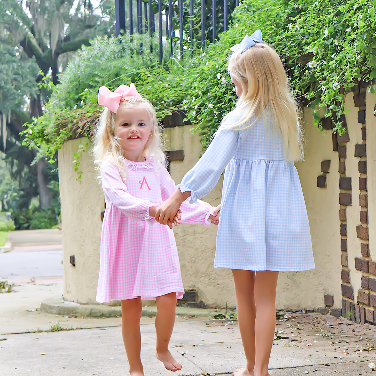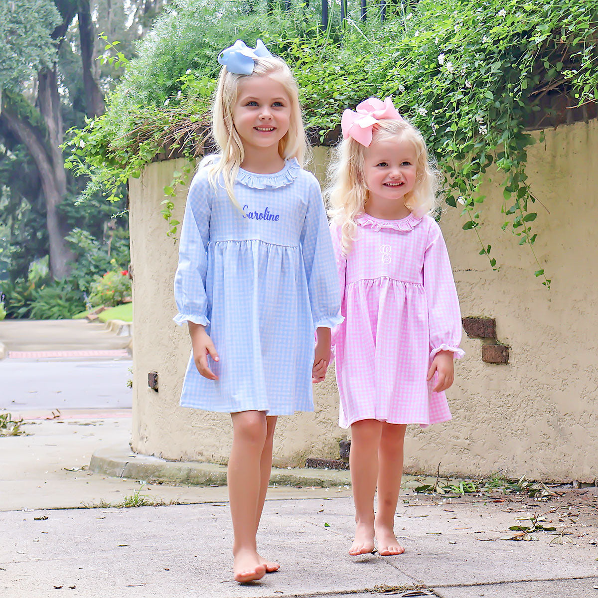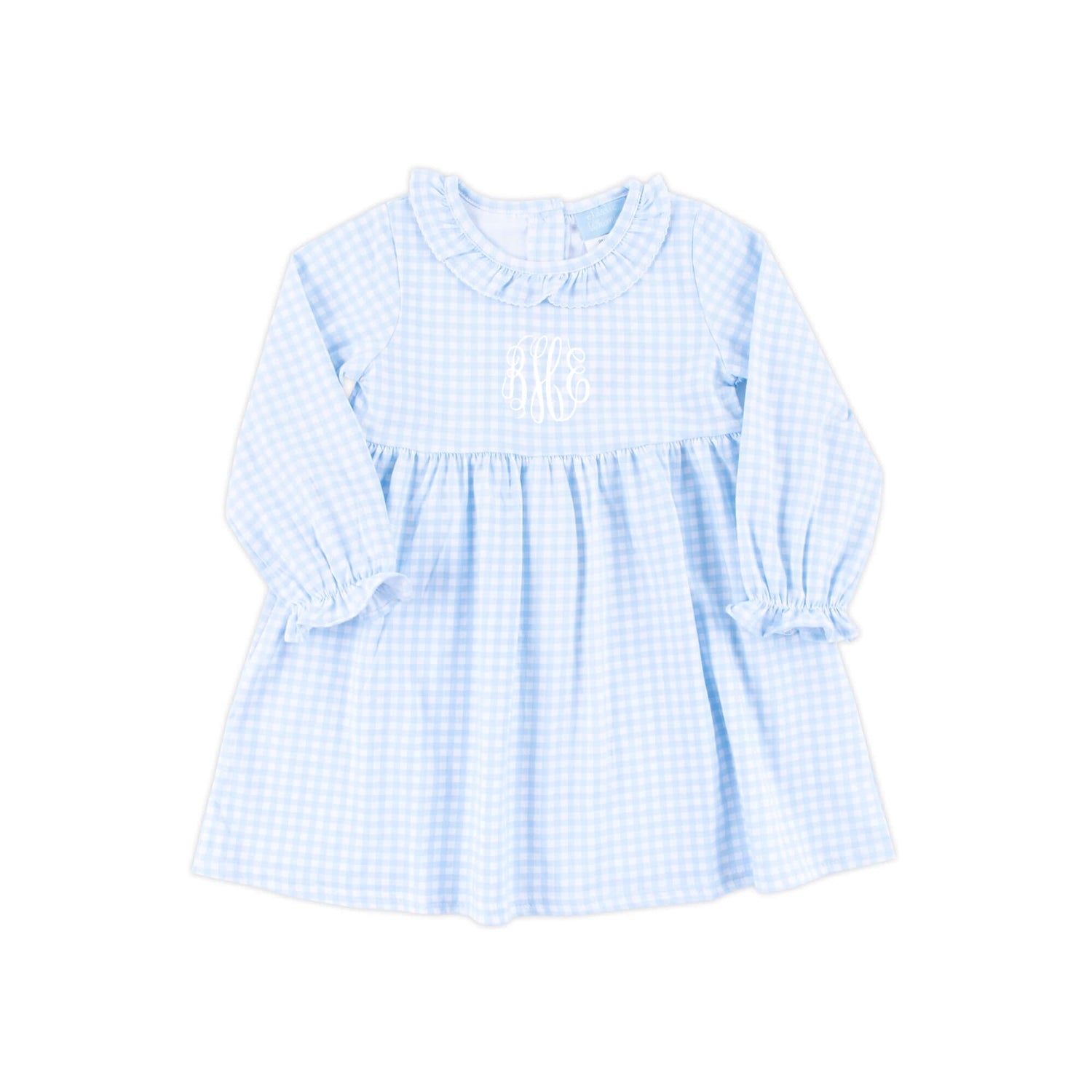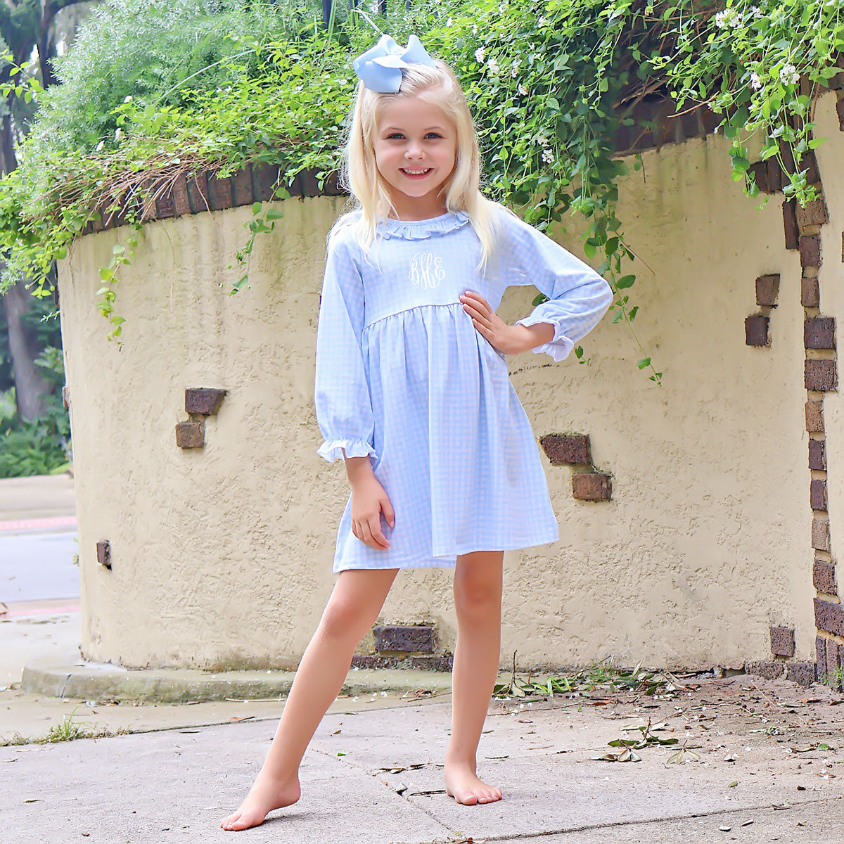 Add a sweet pop of color this fall with our adorable Light Blue Gingham Eden Dress! This charming light blue gingham knit dress features playful long bishop sleeves and a darling ruffle collar, making it the perfect choice for a fun and stylish day out. Plus, you can add a personalized monogram to make it uniquely yours