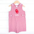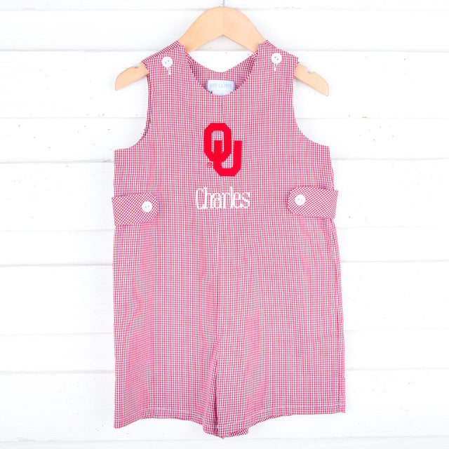 Boomer Sooner! Dress your little one in style this football season with our Oklahoma Embroidered Red Jon Jon. This charming gingham outfit proudly features the OU embroidered logo and includes side tabs for added detail. With convenient snaps in stride and back buttons for closure, it's as practical as it is cute! Personalize it with a name monogram for that extra special touch!