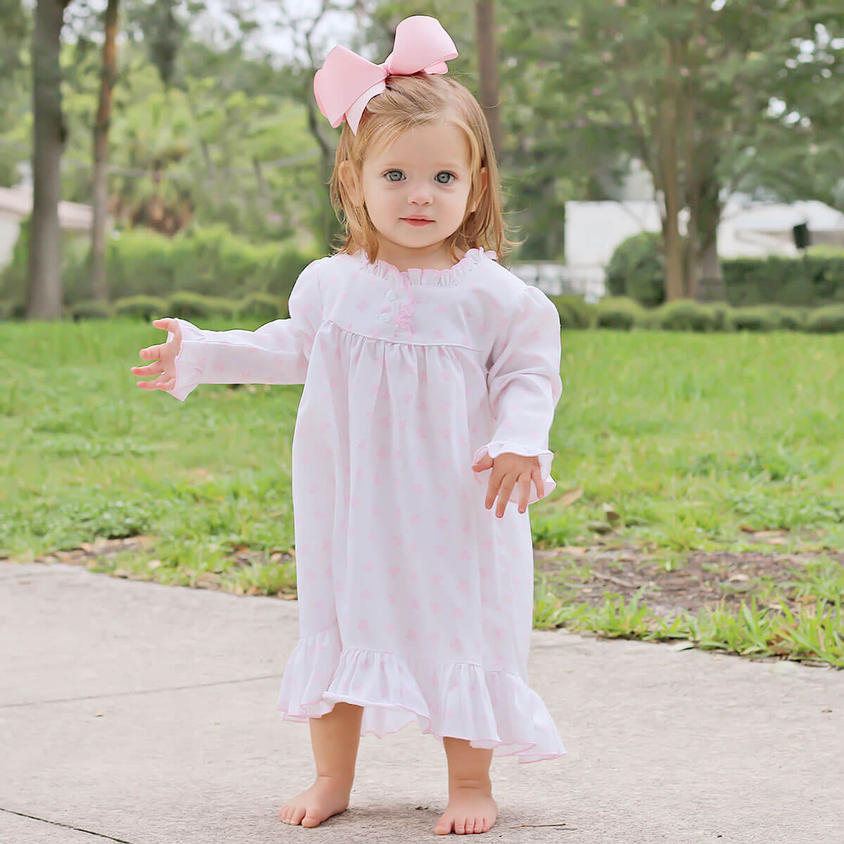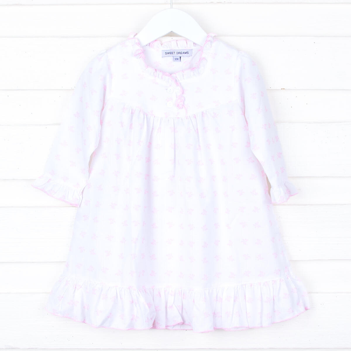 Your little princess will be warm and comfortable sleeping in this Bow Long Sleeve Nightgown. Features ruffle hem details and front buttons. How sweet and adorable is this bow print!
