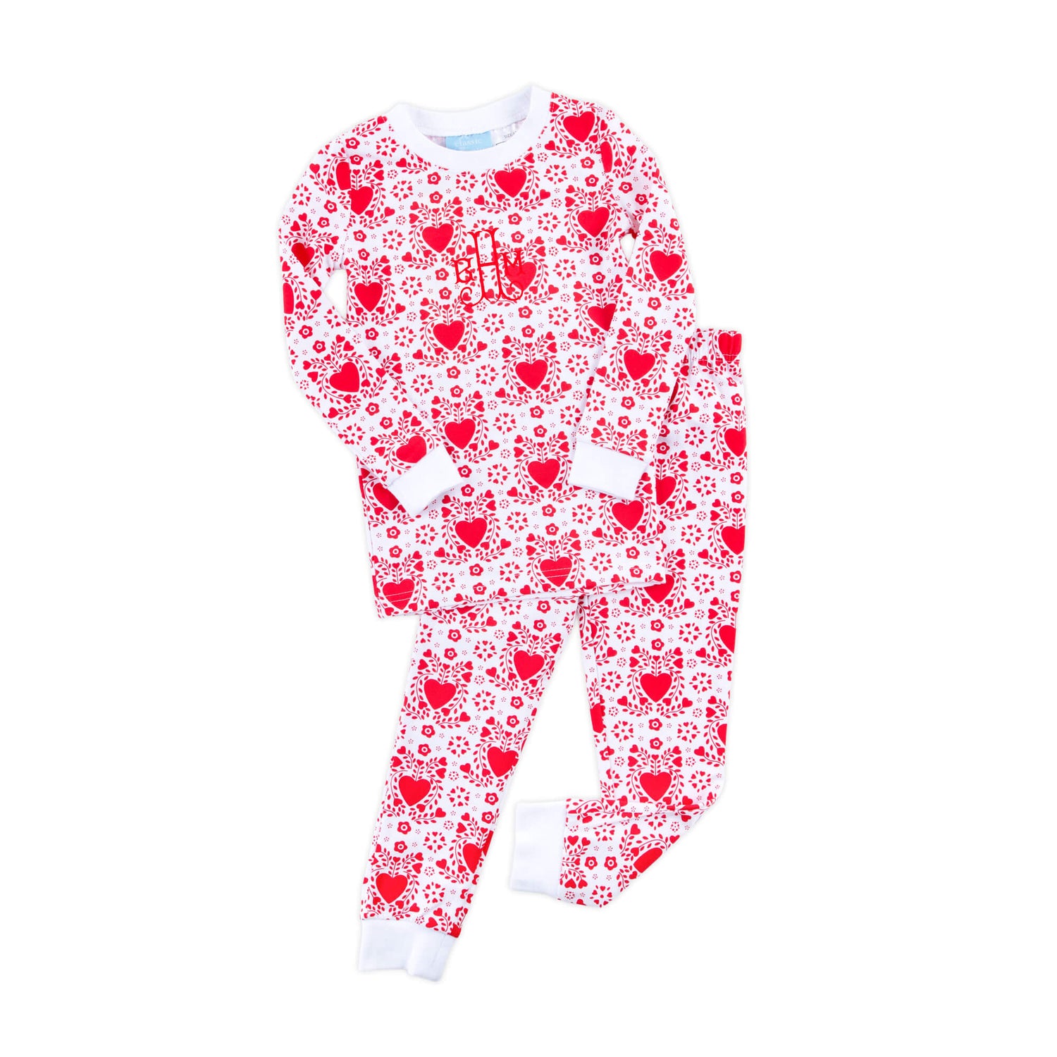 Get ready for bedtime in our comfortable Heart Damask Print Pajamas. This sweet set features a long-sleeve pajama top with a heart damask print and white ribbing, paired with matching bottoms. Soft and snuggle-ready, these pajamas can be personalized with a monogram for an extra special touch.