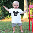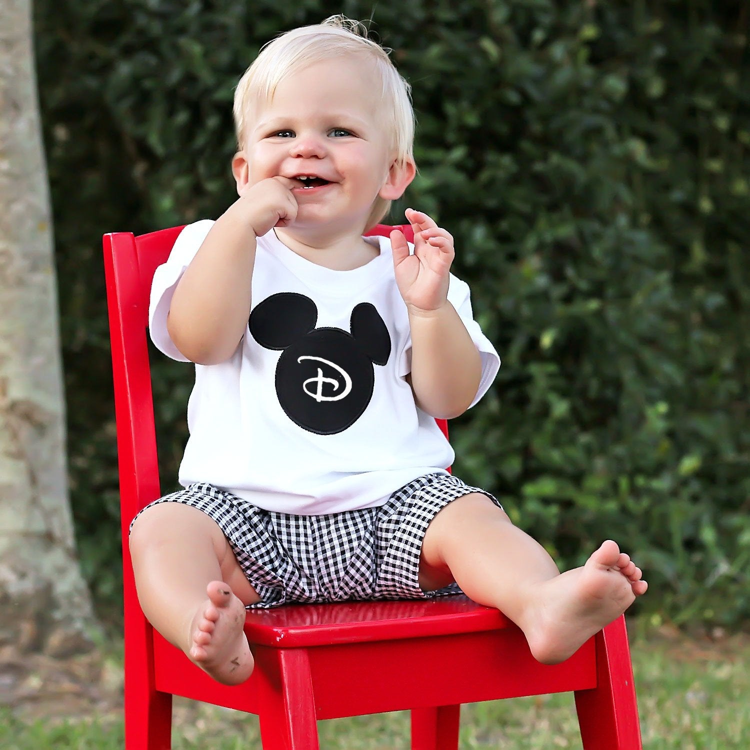 A white knit shirt with black mouse ears applique. Wear with the matching bottoms. Perfect for your next trip!