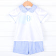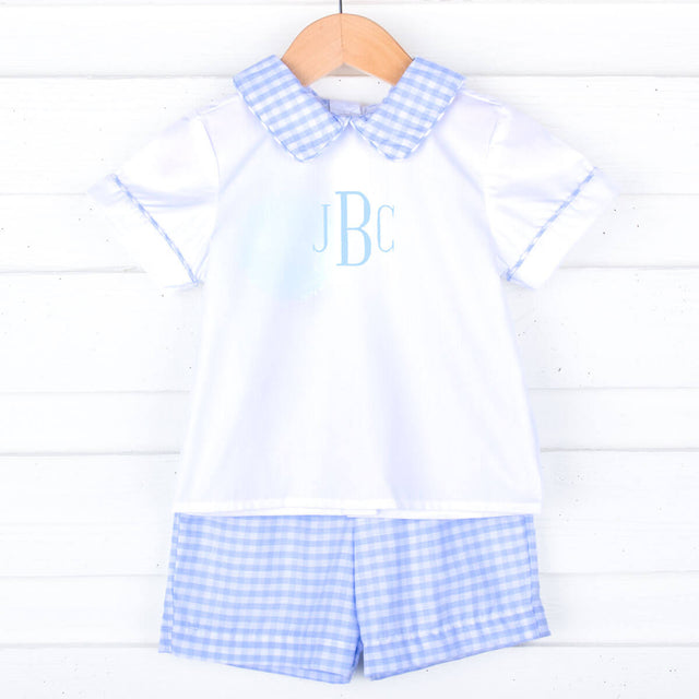 Celebrate Easter in our Light Blue Check Collared Short Set! This charming white short-sleeve shirt features an elegant collar trimmed with light blue check, adding a festive touch. Coordinated with matching light blue check shorts, it’s the perfect outfit for Easter celebrations and family gatherings. Add a monogram to make this outfit extra special!