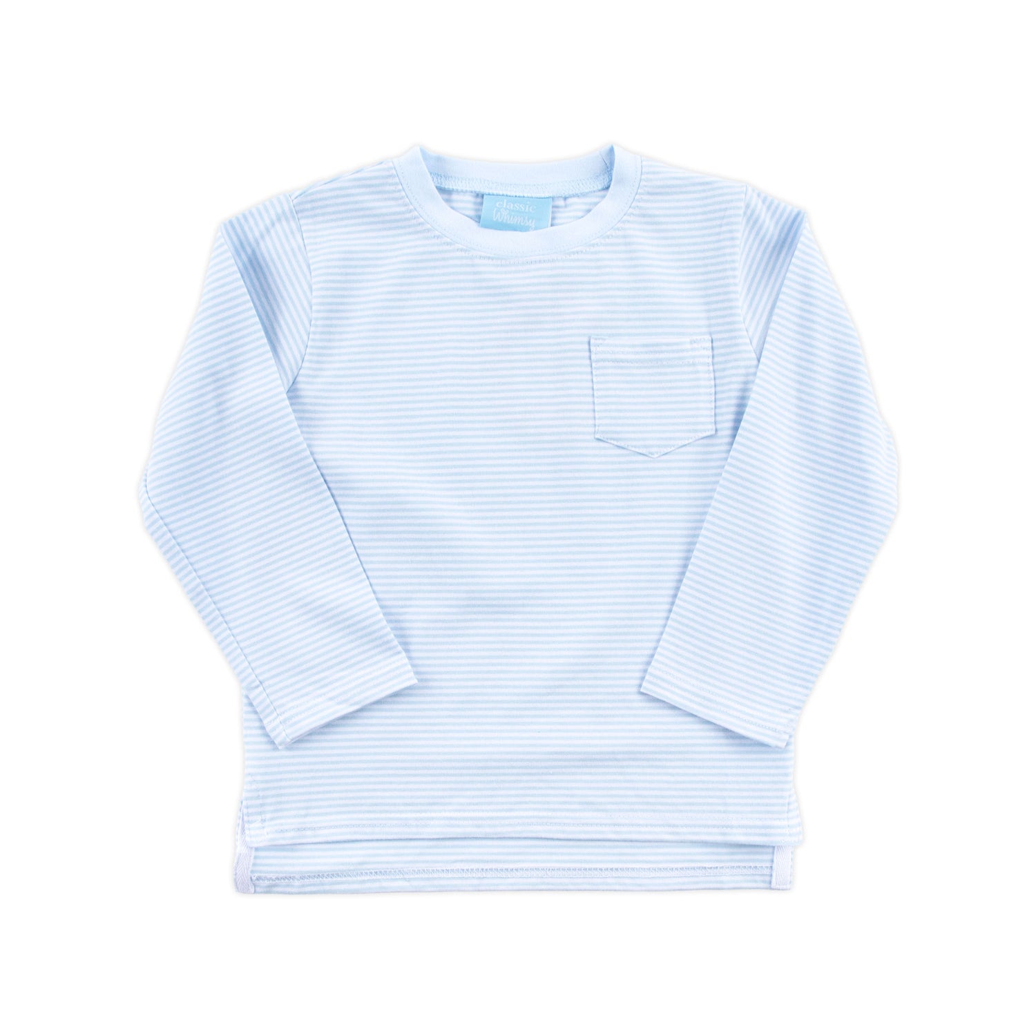 Add this Light Blue Stripe Long Sleeve Pocket Shirt to your little boy's wardrobe for a versatile and stylish staple. This long sleeve t-shirt features timeless style and includes a convenient side pocket, allowing you to mix and match effortlessly with your favorite bottoms. It's great for school, playdates, family outings, or casual everyday wear, bringing a playful and polished touch to any occasion. Personalize it with a monogram to make it uniquely his and add an extra special detail to his outfit.
