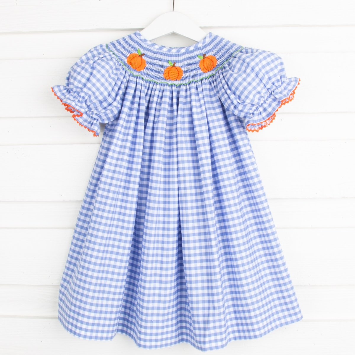 This adorable Bountiful Pumpkins Blue Smocked Bishop Dress is the perfect pumpkin-themed outfit for your little one. It features hand-smocked pumpkins on blue gingham and classic bishop sleeves trimmed with orange ric-rac.