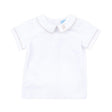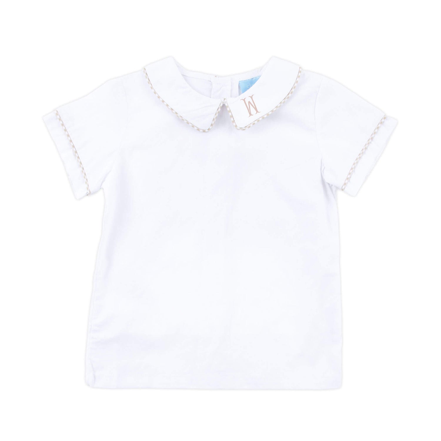 Both stylish and versatile, this White Short Sleeve Undershirt With Tan Gingham Trim is ideal for layering under longalls or jon jons or can be worn alone with a coordinating short -- in this case, we love a big center 3 Letter monogram! Or personalize it with a name on the collar to make it even more unique.