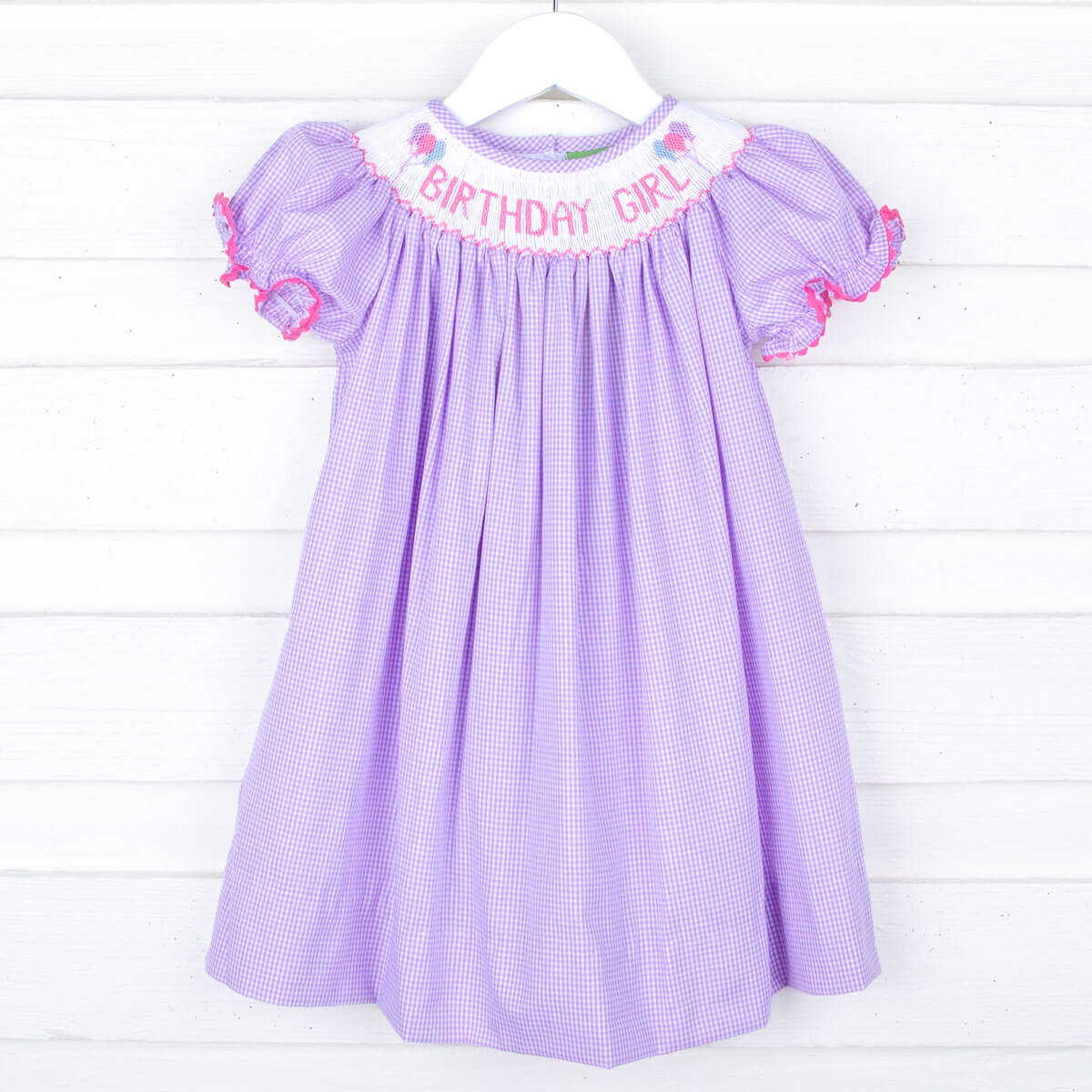 Celebrate your little one's birthday party in style with our Birthday Girl Smocked Dress. This sweet lavender gingham dress features hand-smocked "Birthday Girl" detailing. Adorable bishop sleeves with candy pink ric-rac trim add an extra touch of charm.